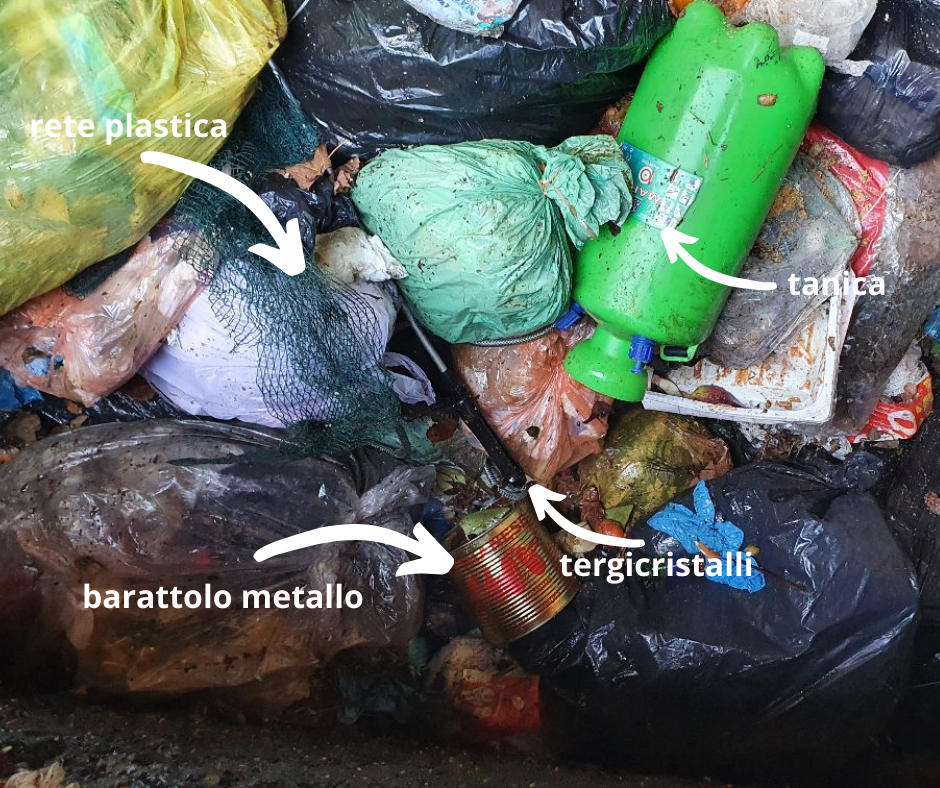materiali non conformi quali: bottiglie di plastica, guanti, barattoli di metallo ecc. tutti rifiuti che non è possibile confondere con il materiale organico biodegradabile.