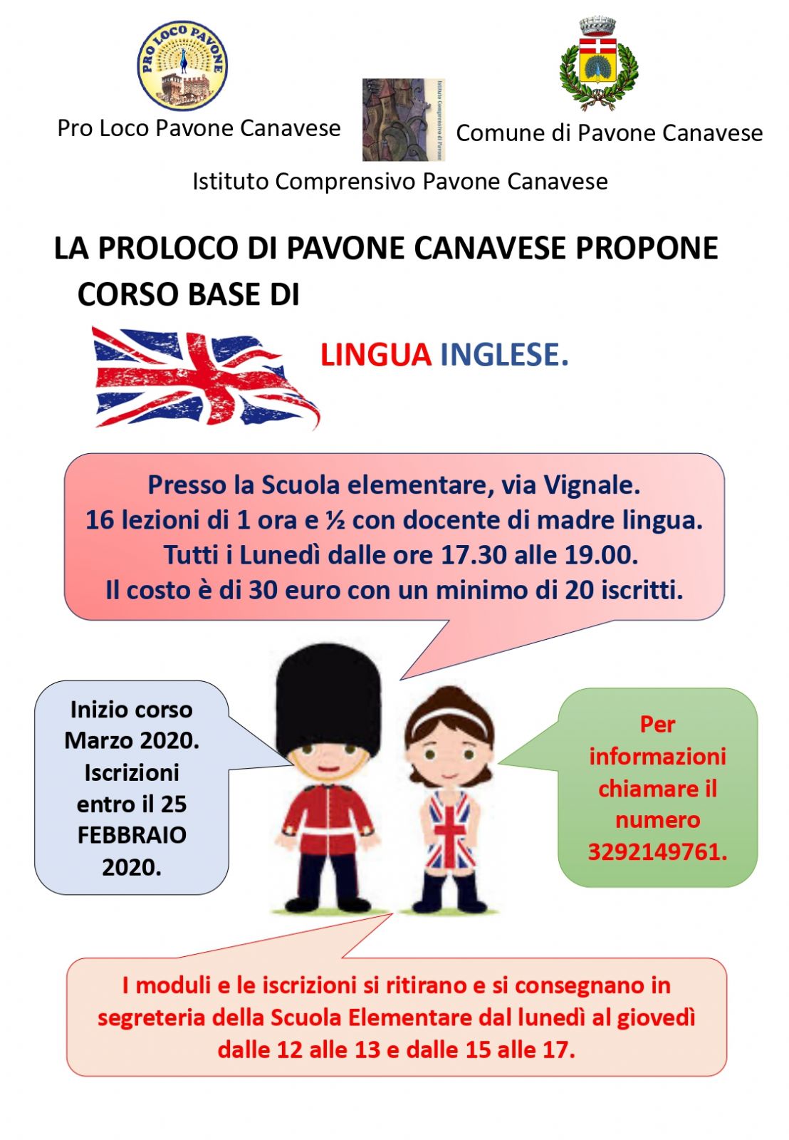 La proloco di Pavone Canavese propone un corso base di lingua inglese con docente di madre lingua che si terrà presso la scuola elementare a partire dal mese di marzo. Nel volantino allegato tutte le informazioni