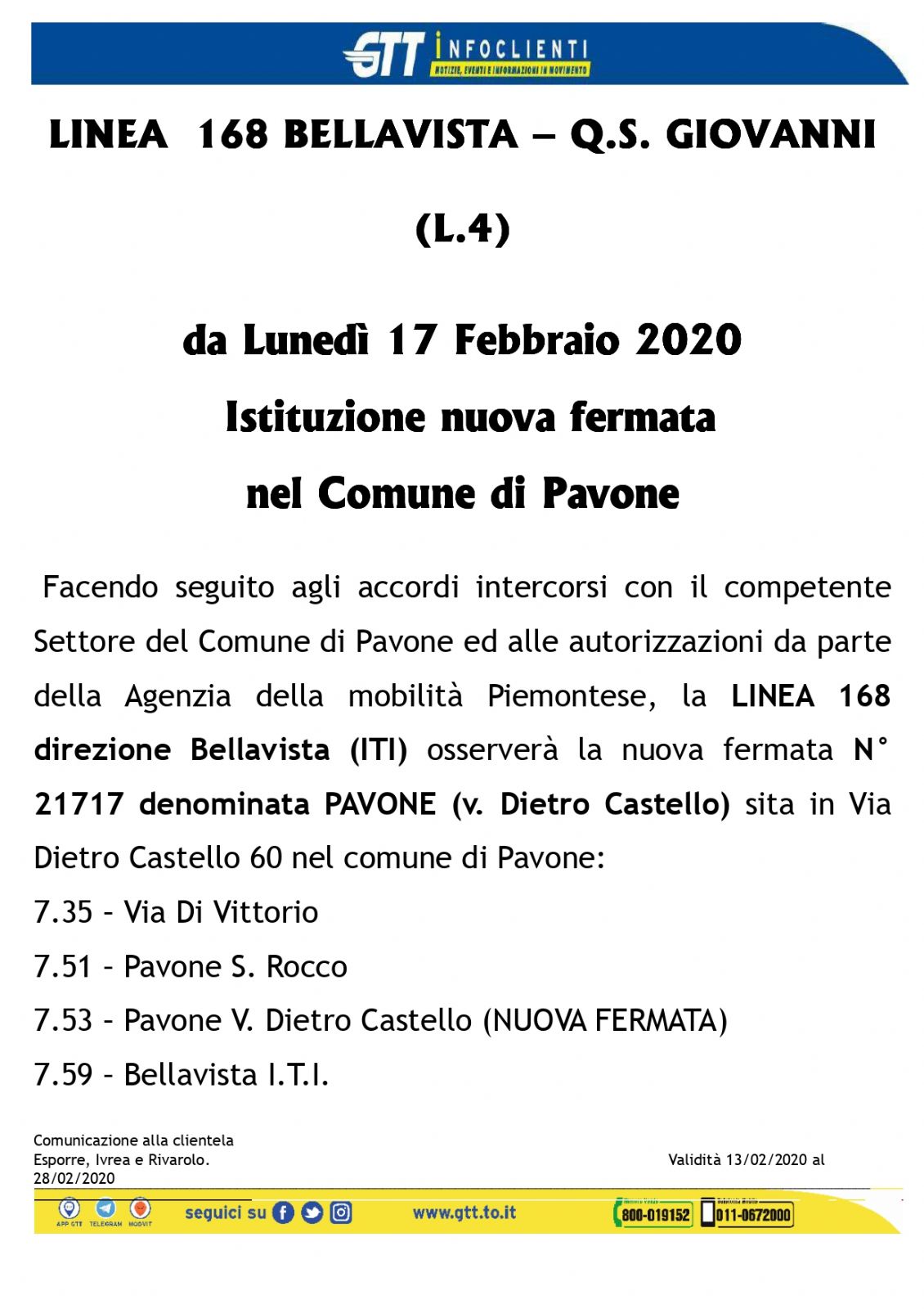 Da lunedì 17 febbraio 2020 la linea 168 direzione Bellavista ITI osserva la nuova fermata n. 21717 denominata PAVONE (v. Dietro Castello) sita in via Dietro Castello 60. Nel volantino allegato, informativa con gli orari