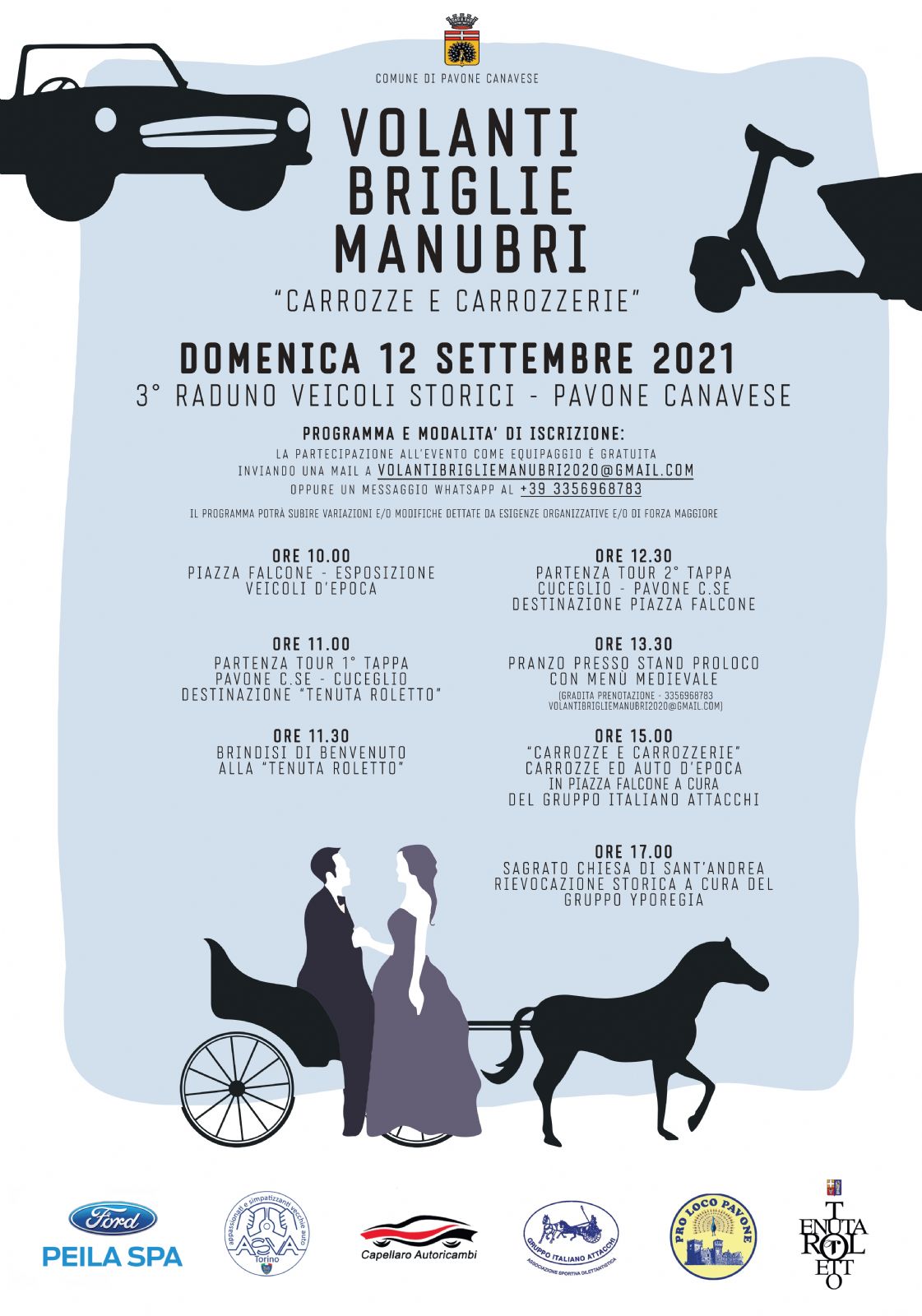 L’evento organizzato dall’Amministrazione comunale vede la collaborazione del Club Appassionati e Simpatizzanti Vecchie Auto di Torino, il Gruppo Italiano Attacchi, Capellaro Autoricambi, la Pro Loco di Pavone C.se, Tenuta Roletto di Cuceglio con la sponsorizzazione di Ford Peila S.p.A.