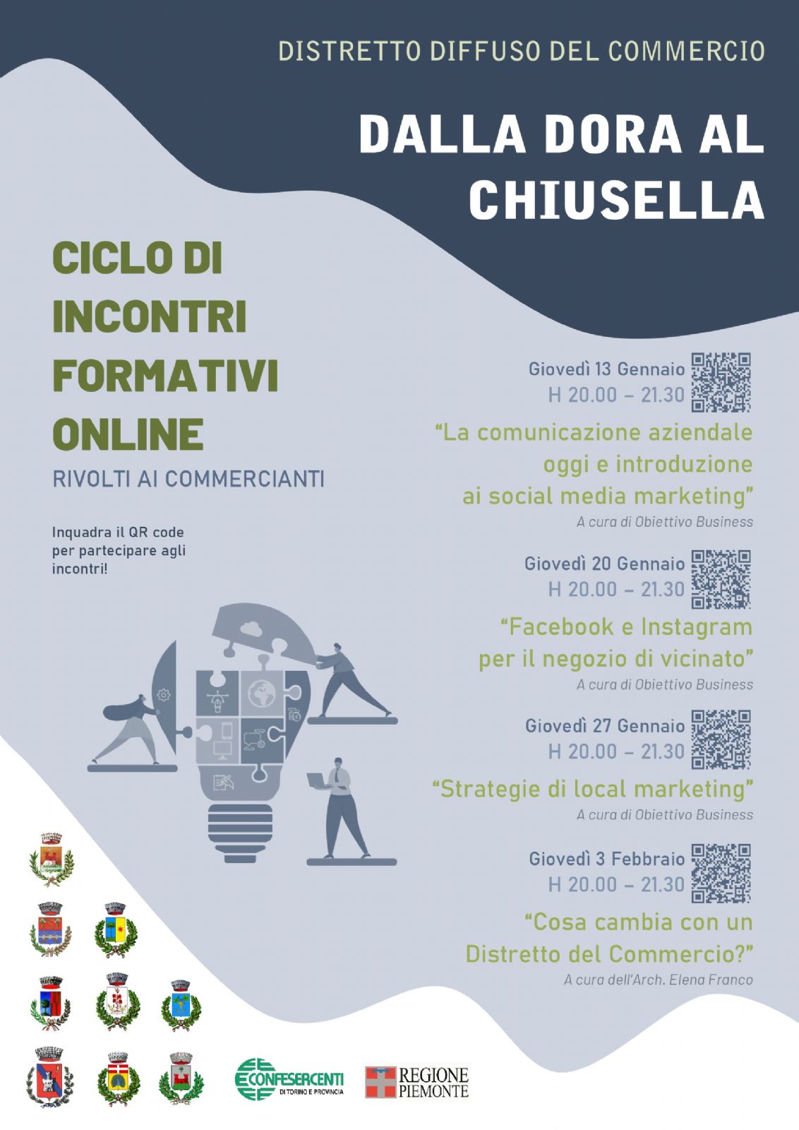 La prima attività del Distretto “Dalla Dora al Chiusella” è un ciclo di 4 incontri formativi online, gratuiti, rivolto agli operatori commerciali, agli esercenti, agli operatori turistici, con l’obiettivo di valorizzare e qualificare la rete commerciale del DDC.