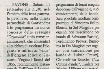 Il diciassettesimo concerto riporterà Organalia in Canavese e, precisamente a Pavone Canavese per ascoltare l’elegante e raffinata “voce” dell’organo Felice e Giacomo Vegezzi Bossi del 1855, recentemente restaurato da Dell’Orto & Lanzini”, per un concerto che vedrà “a singolar tenzone” il re degli strumenti e la banda.