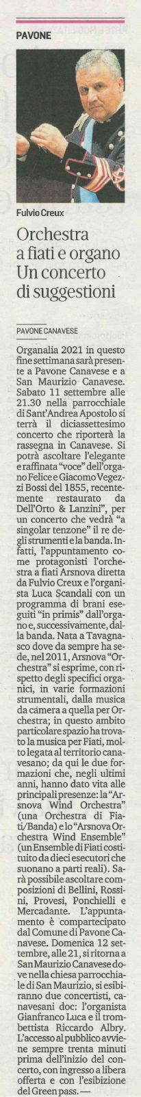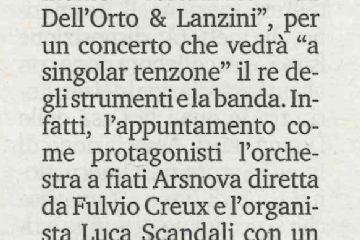 Infatti, l’appuntamento avrà quali protagonisti l’orchestra a fiati Arsnova diretta da Fulvio Creux e l’organista Luca Scandali con un programma di brani eseguiti “in primis” dall’organo e, successivamente, dalla banda.