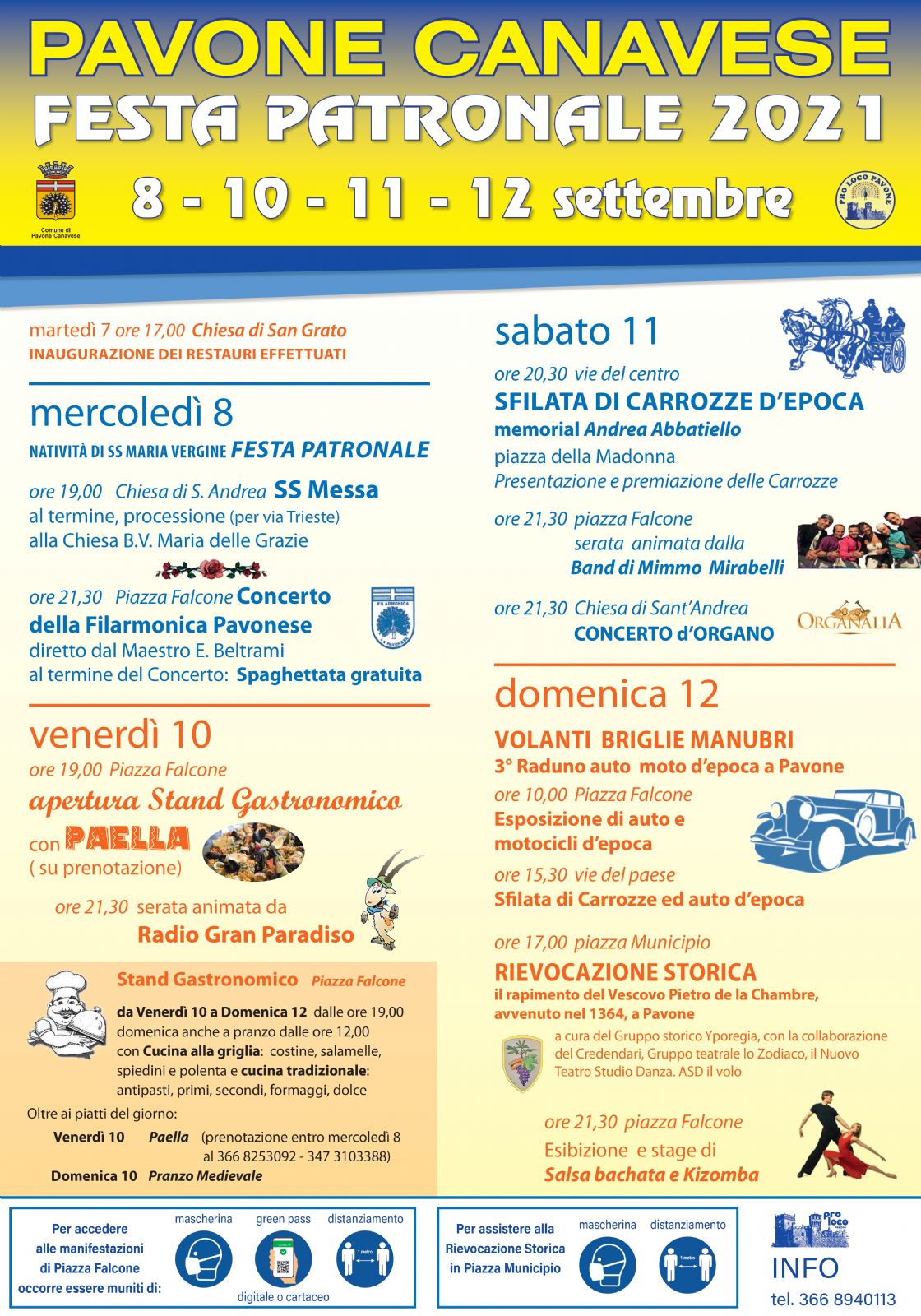 I visitatori potranno fare un tuffo nel passato grazie al raduno d’auto, motocicli d’epoca e carrozze, le novità di quest'anno sono: il giro turistico che porterà i partecipanti con i loro veicoli storici da Piazza Falcone a Pavone Canavese alla Tenuta Roletto a Cuceglio per un brindisi alla scoperta dell'Erbaluce spumante, rientrati in Piazza Falcone, seguirà il pranzo a cura della Pro Loco di Pavone C.se con un menù caratterizzato da ricette di origine medievale.