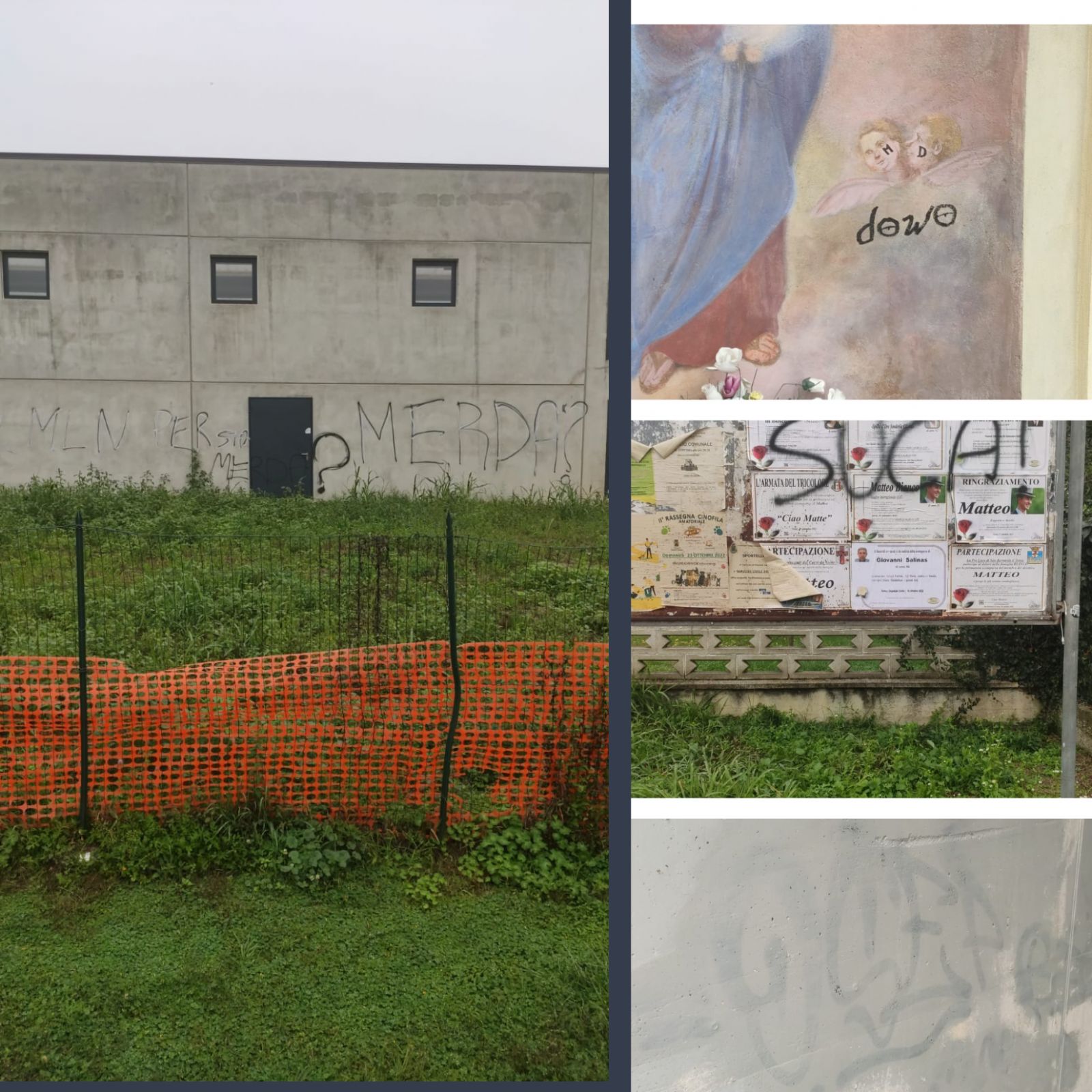 Il primo sfregio è stato fatto sul pilone votivo davanti al Cimitero, il secondo nel sottopasso; ultimamente, con più frequenza, sono stati imbrattati nuovamente il pilone votivo, appena restaurato e il sottopasso, altri manufatti del paese, le epigrafi di via Vignale davanti alle Scuole e per ultimo il retro del nuovo magazzino della Protezione Civile.