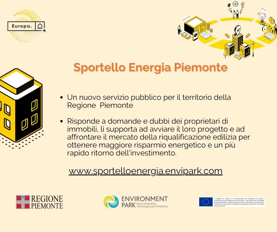 Lo sportello Energia si propone come un nuovo servizio pubblico dedicato ai cittadini del territorio piemontese. Esso fornisce l'opportunità di usufruire di una consulenza gratuita finalizzata a rispondere a domande e dubbi dei proprietari di immobili che debbano affrontare lavori di riqualificazione energetica della loro casa. Lo Sportello li supporta a chiarire aspetti tecnici e finanziari legati all'attuazione dell'intervento, ad avviare il loro progetto e ad affrontare con i giusti strumenti informativi il mercato della ristrutturazione edilizia per ottenere un maggiore risparmio energetico e un più rapido ritorno del loro investimento.