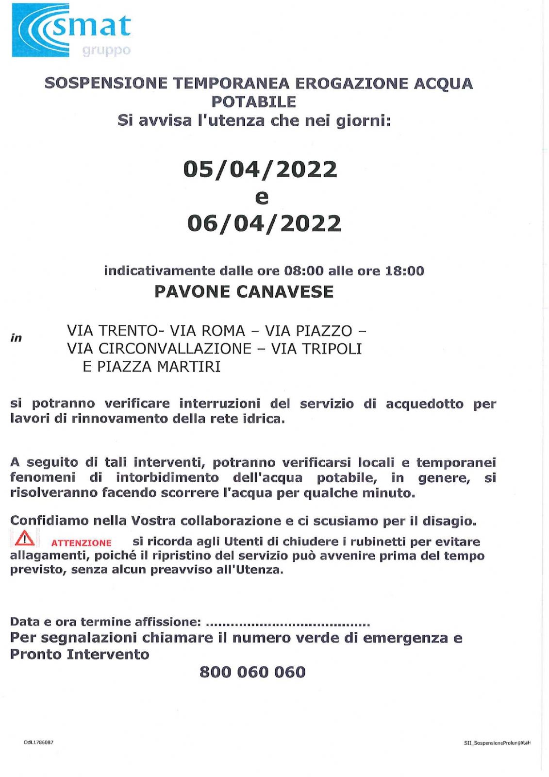 che nei giorni 5 e 6 Aprile, si potranno verificare interruzioni del servizio di acquedotto, per lavori di rinnovamento della rete idrica.