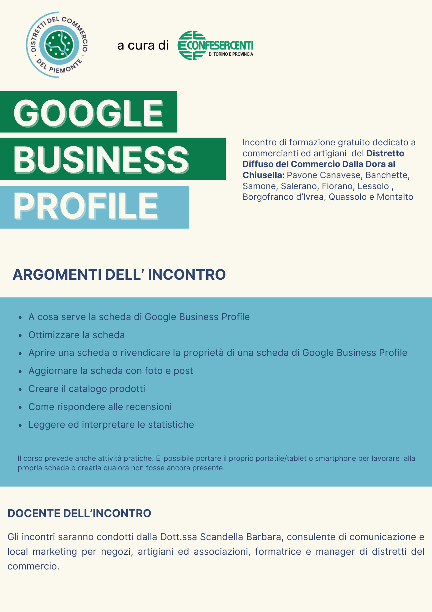 I Comuni del Distretto "Dalla Dora al Chiusella", in collaborazione con Confesercenti di Torino e Provincia, organizzano un nuovo ciclo di incontri formativi gratuiti rivolto ai propri commercianti e artigiani, a titolo "Google Business Profile".