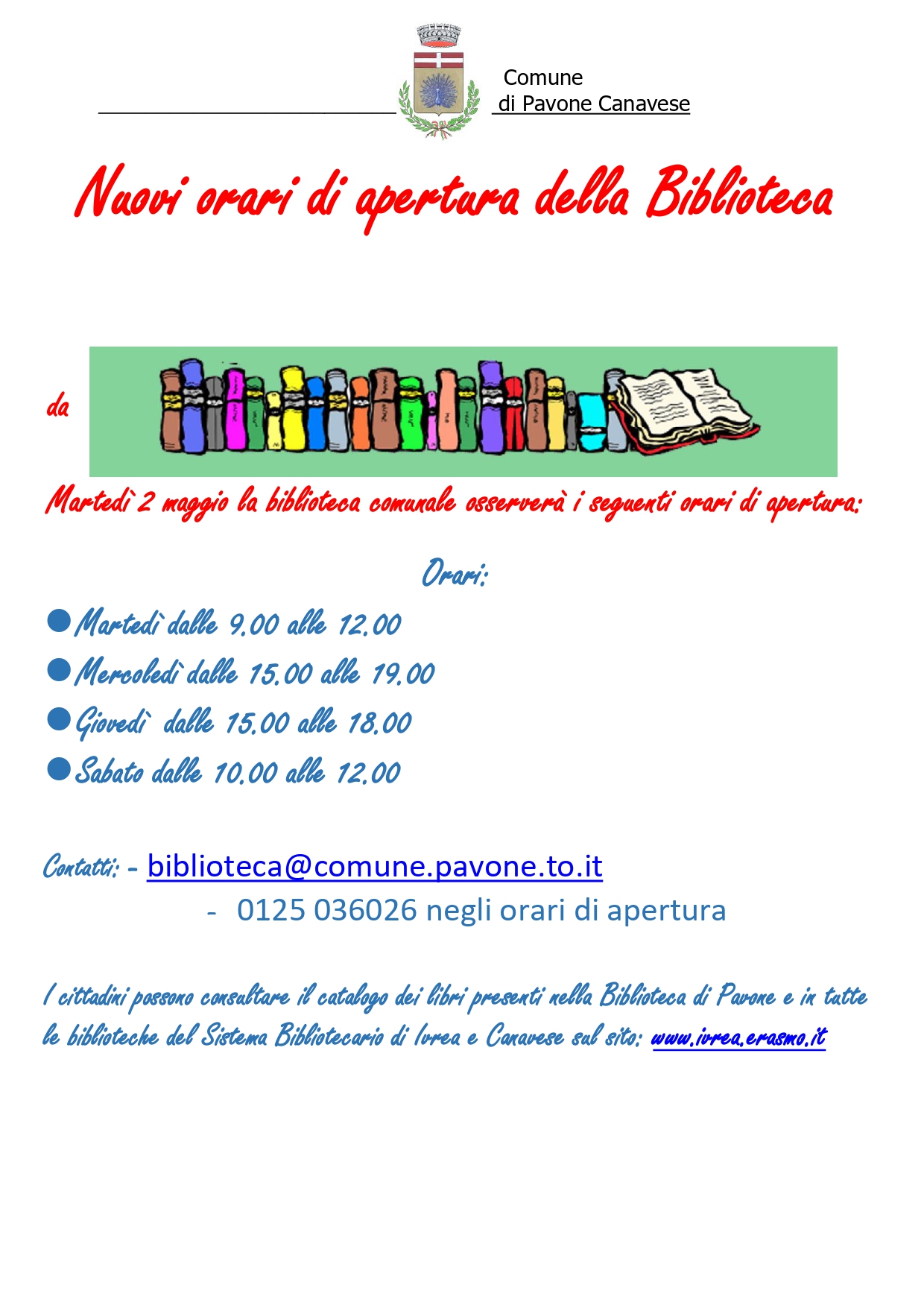 A partire da martedì 2 Maggio la Biblioteca Comunale di Pavone Canavese, con sede in Via Giuseppe Quilico n. 1, avrà i seguenti orari :
