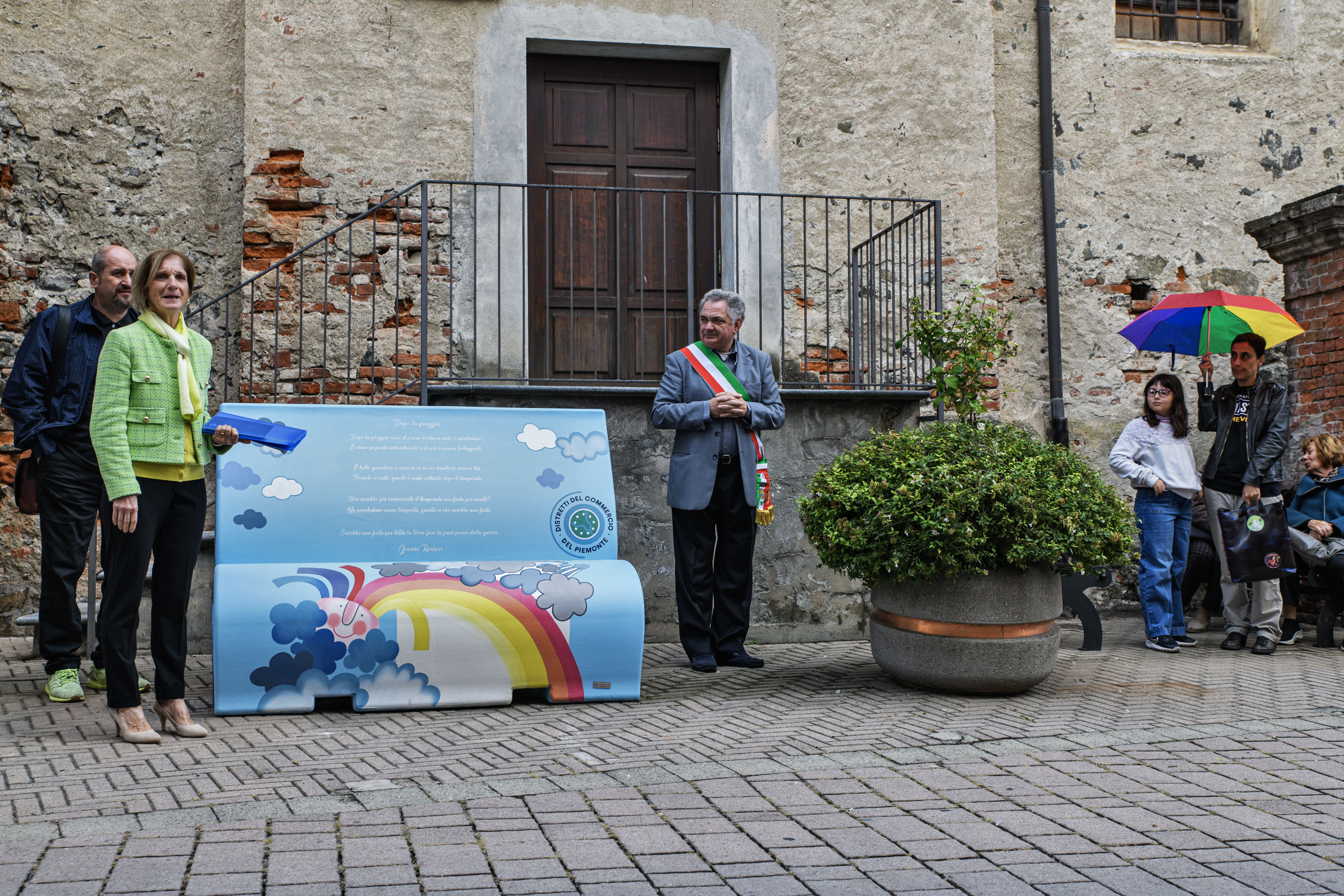 Per questo vicino alla Biblioteca, fiore all'occhiello del Paese, all'angolo dei poeti, inaugurato a giugno, si è scelto di installare la panchina letteraria dedicata al libro per avvicinare alla lettura i cittadini di tutte le età. Il libro aperto, rappresenta la copertina del libro di Gianni Rodari "Perché l'arcobaleno esce quando piove" e la poesia si intitola "Dopo la pioggia "che è stata recitata da Celeste. Tutti conosciamo Rodari per le sue favole, filastrocche e poesie; con un linguaggio semplice lancia messaggi forti. In questa poesia si rilancia il tema attualissimo della pace e della speranza. Altre due panchine in acciaio contrapposte, vogliono essere il richiamo a chi vuole fare una pausa per una piacevole chiacchierata.