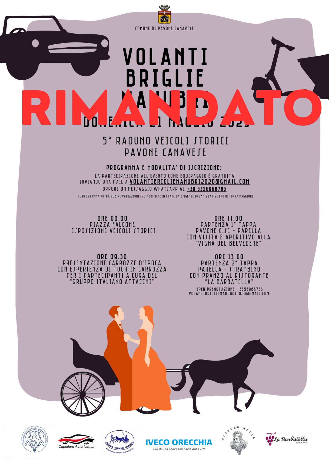A causa delle avverse previsioni meteorologiche previste per il weekend dal 19 al 21 maggio, l'Amministrazione comunale e gli organizzatori della manifestazione hanno deciso di RIMANDARE la manifestazione " Volanti, Briglie e Manubri" al 24 SETTEMBRE 2023.
