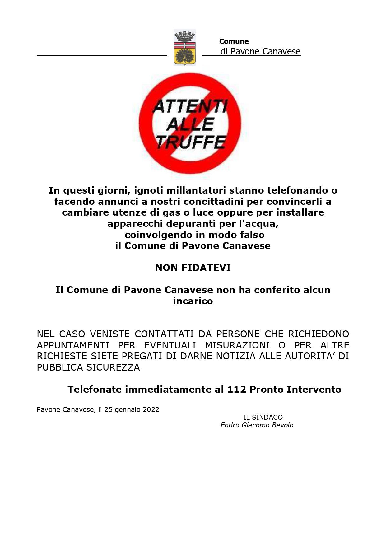 In questi giorni, ignoti millantatori stanno telefonando o facendo annunci a nostri concittadini per convincerli a cambiare utenze di gas o luce oppure per installare apparecchi depurati con l'acqua, coinvolgendo in modo falso il Comune di Pavone Canavese.
