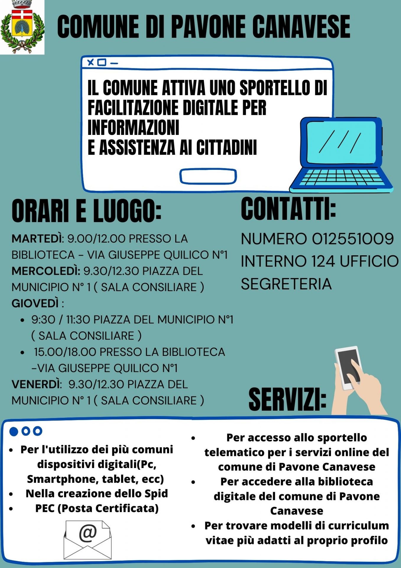 Il Comune di Pavone Canavese tramite il "SERVIZIO CIVILE DIGITALE" offre supporto, facilitazione e assistenza nell'utilizzo dei suoi servizi online e nell'accesso tramite SPID e CIE per quelli della pubblica amministrazione.