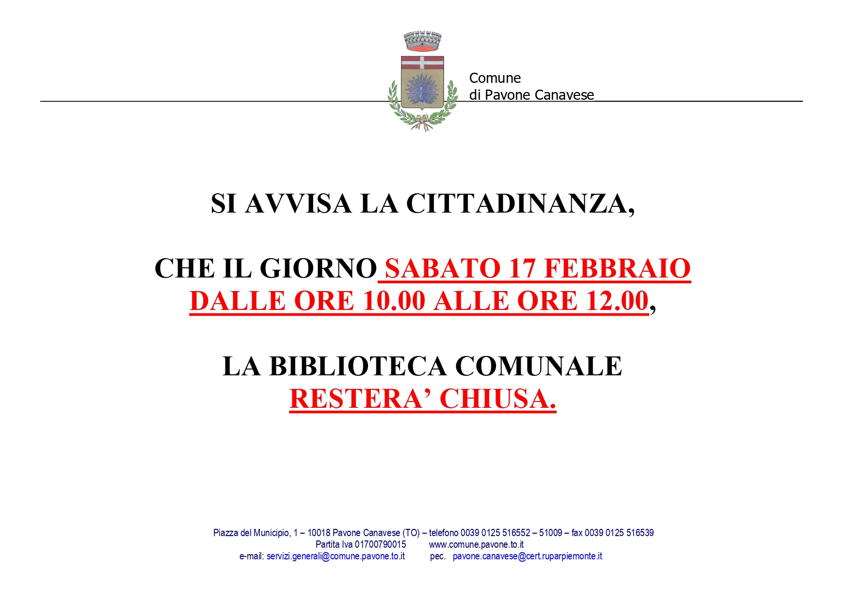 che il giorno sabato 17 febbraio 2024 dalle ore 10.00 alle ore 12.00 la biblioteca comunale resterà chiusa.