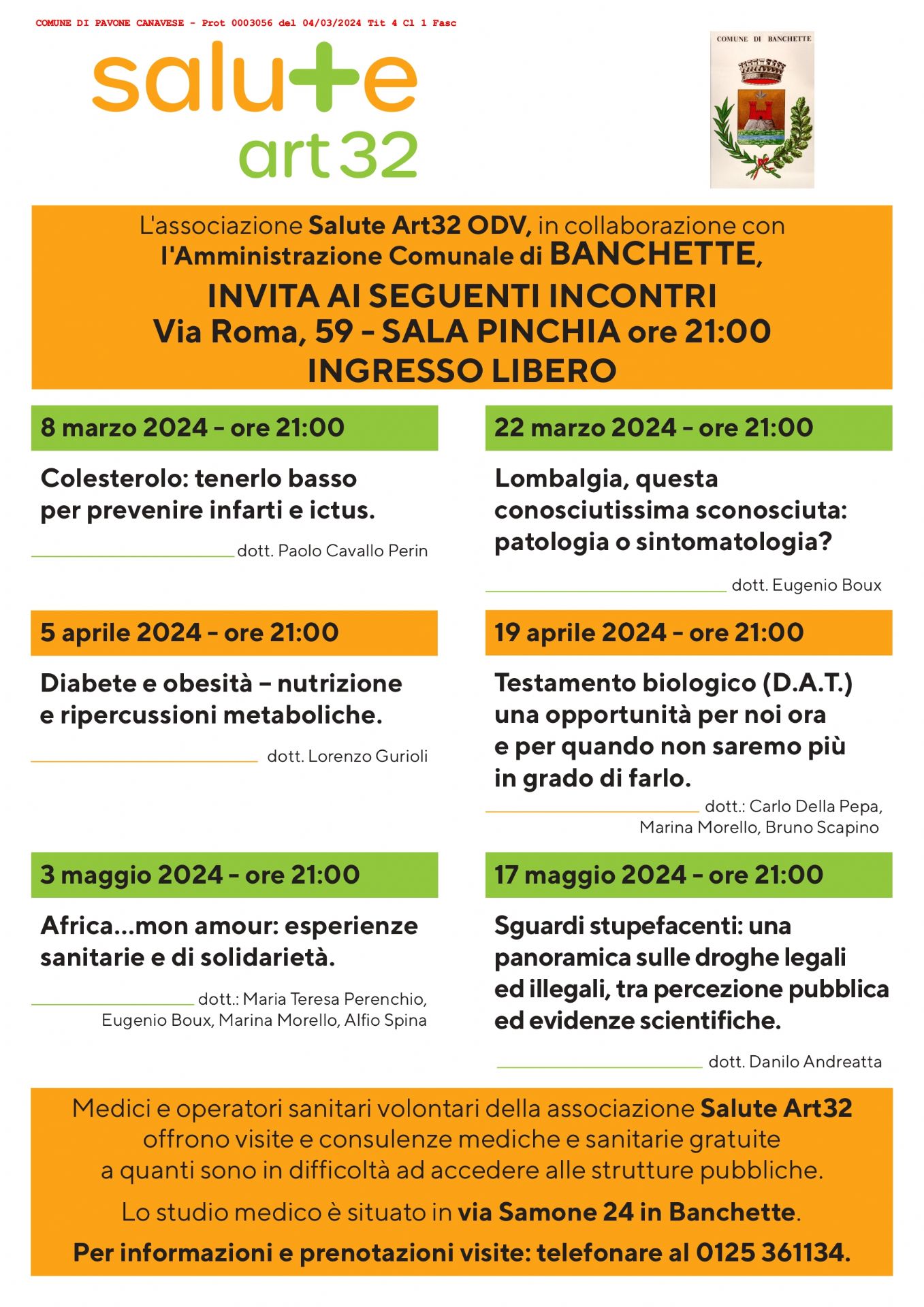 L’Associazione “Salute art 32”, in collaborazione con il Comune di Banchette, da venerdì 8 marzo terrà dei nuovi