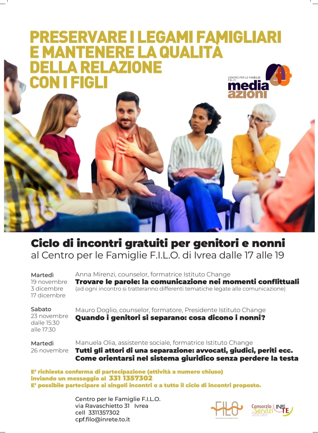 Il Centro Famiglie F.I.L.O. e il Consorzio In.Re.Te. organizzano un ciclo di incontri rivolto