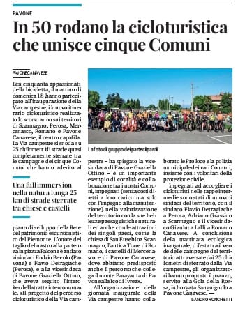 È stata un'occasione per riscoprire il nostro bel territorio e per vivere una mattinata in libertà a contatto con la natura e in compagnia. Il tour è partito da Piazza Falcone a Pavone Canavese con il taglio del nastro tricolore inaugurando cosi la nuova pista ciclabile, ed è proseguito in allegria toccando i diversi Comuni, i quali hanno accolto calorosamente la comitiva in transito, presenti con le rispettive compagini amministrative e i volontari che hanno contribuito al successo dell'evento.
