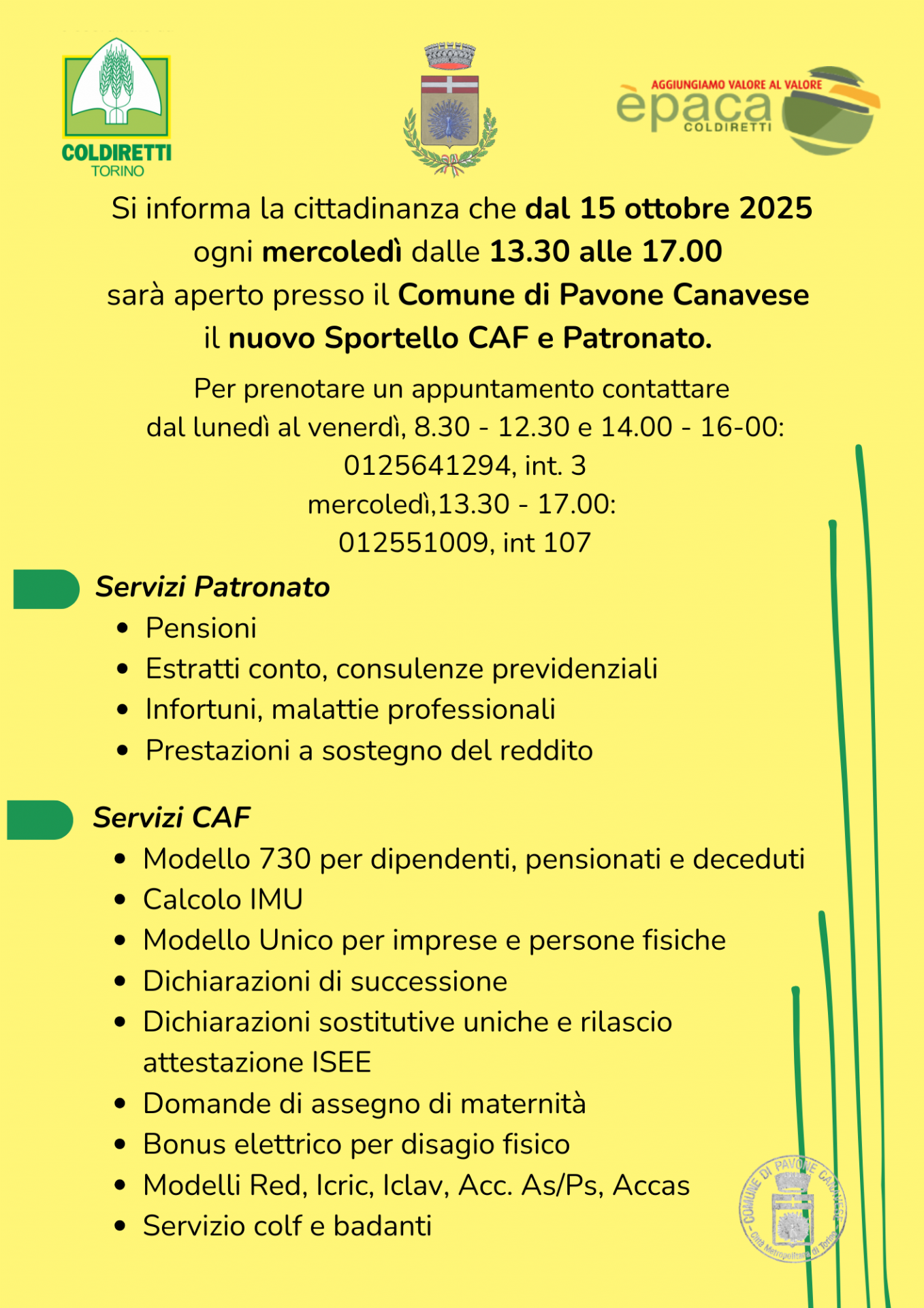 L'Amministrazione Comunale informa la cittadinanza che da mercoledì 15 ottobre, grazie alla collaborazione con la Coldiretti di Ivrea, sarà operativo all’interno del palazzo comunale in Piazza Municipio 1 il nuovo sportello che erogherà servizi di patronato e di assistenza fiscale.