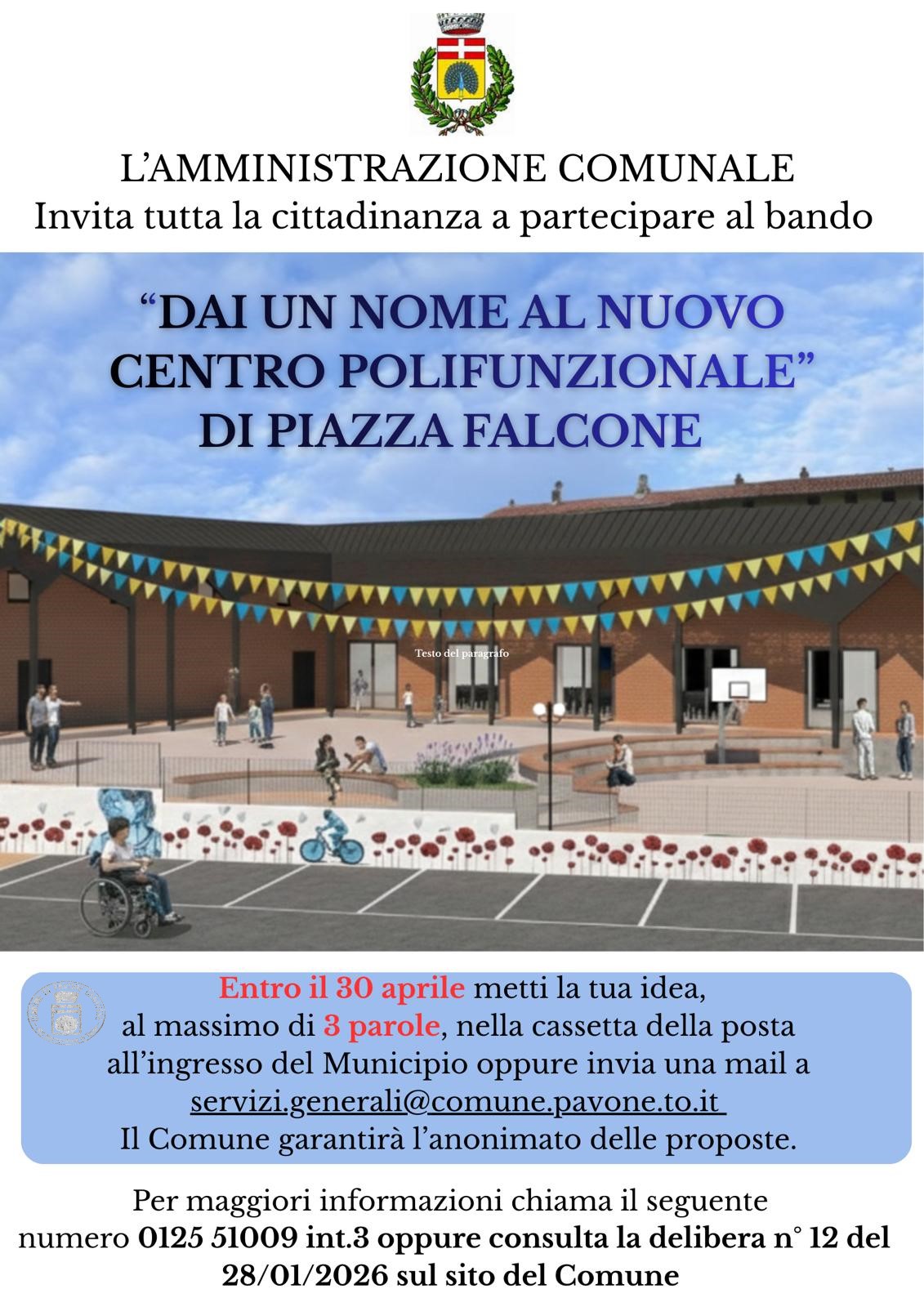 L'Amministrazione Comunale invita la cittadinanza a partecipare al bando "Dai un nome al nuovo Centro Polifunzionale di Piazza Falcone".