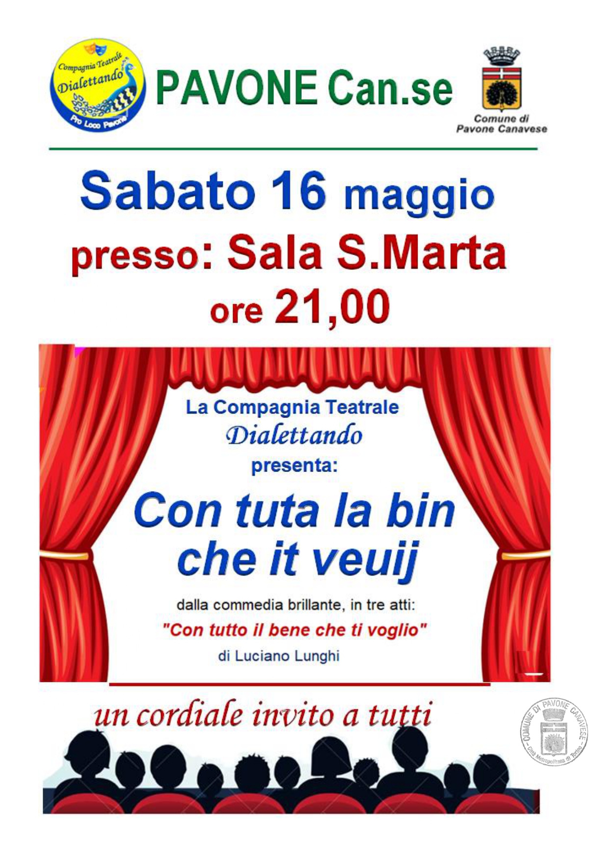 La Pro Loco di Pavone Canavese, in collaborazione con l'Amministrazione Comunale, invita la cittadinanza a partecipare allo spettacolo teatrale “Con tuta la bin che it veuij”, presentata dalla Compagnia Teatrale Dialettando.