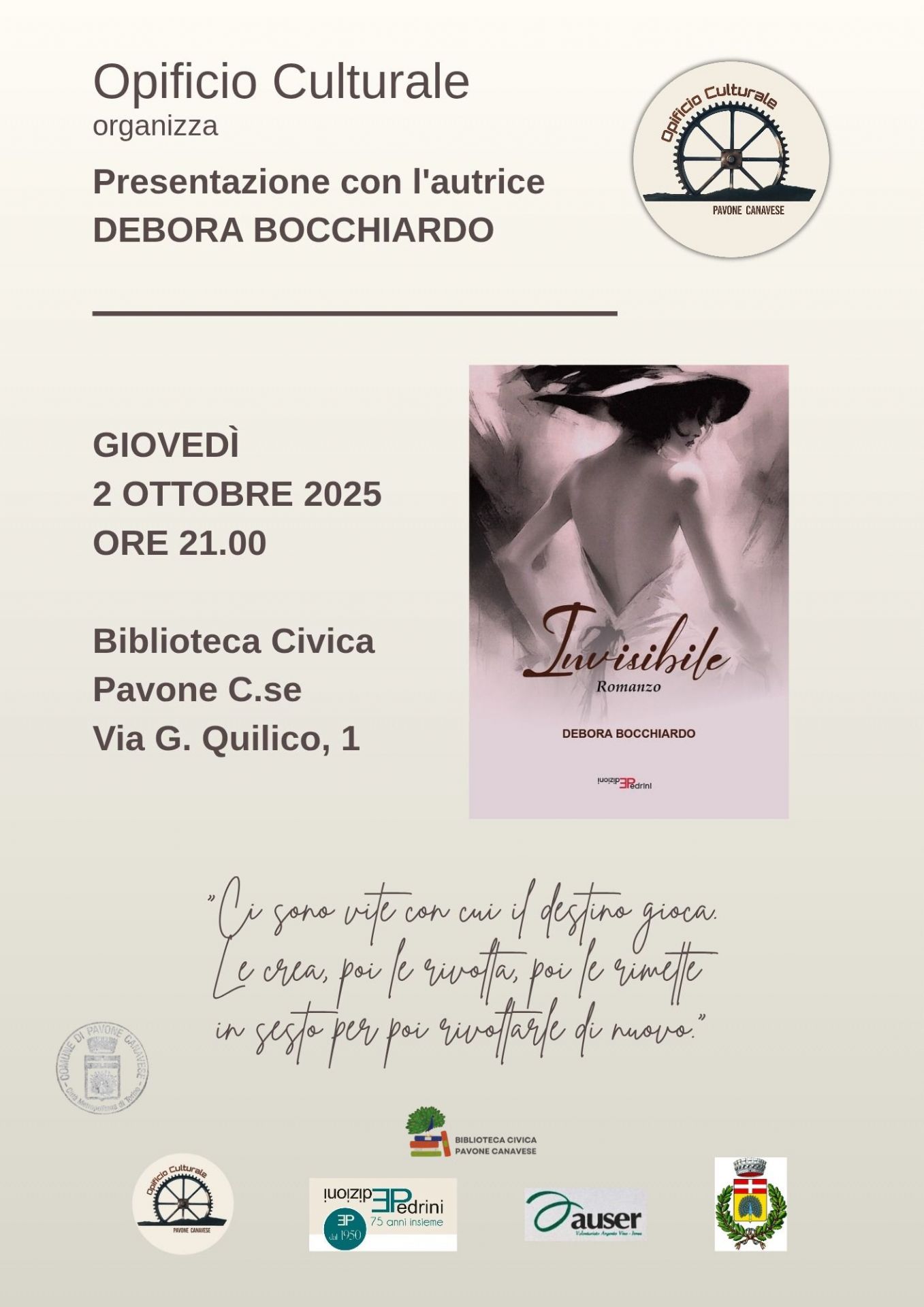 Il prossimo appuntamento sarà dedicato alla presentazione del romanzo Invisibile (Pedrini Editore) di Debora Bocchiardo, che si terrà: