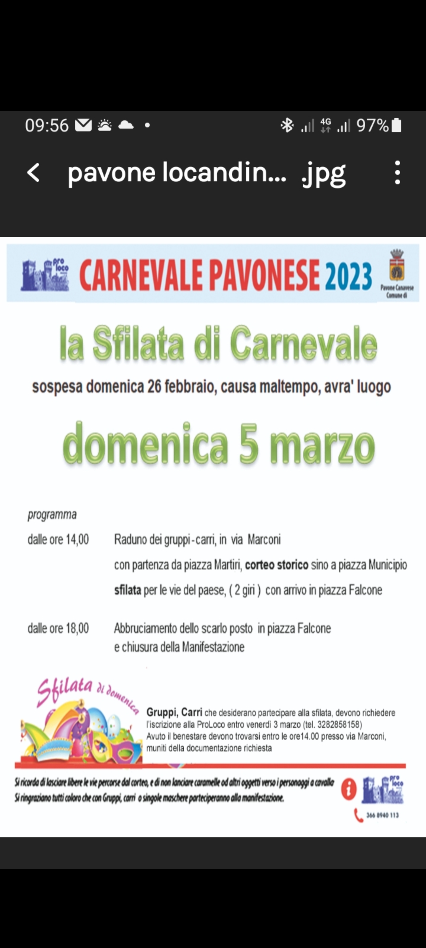 La sfilata di Carnevale, che era stata sospesa la scorsa domenica a causa del maltempo, avrà luogo domenica 5 marzo.
