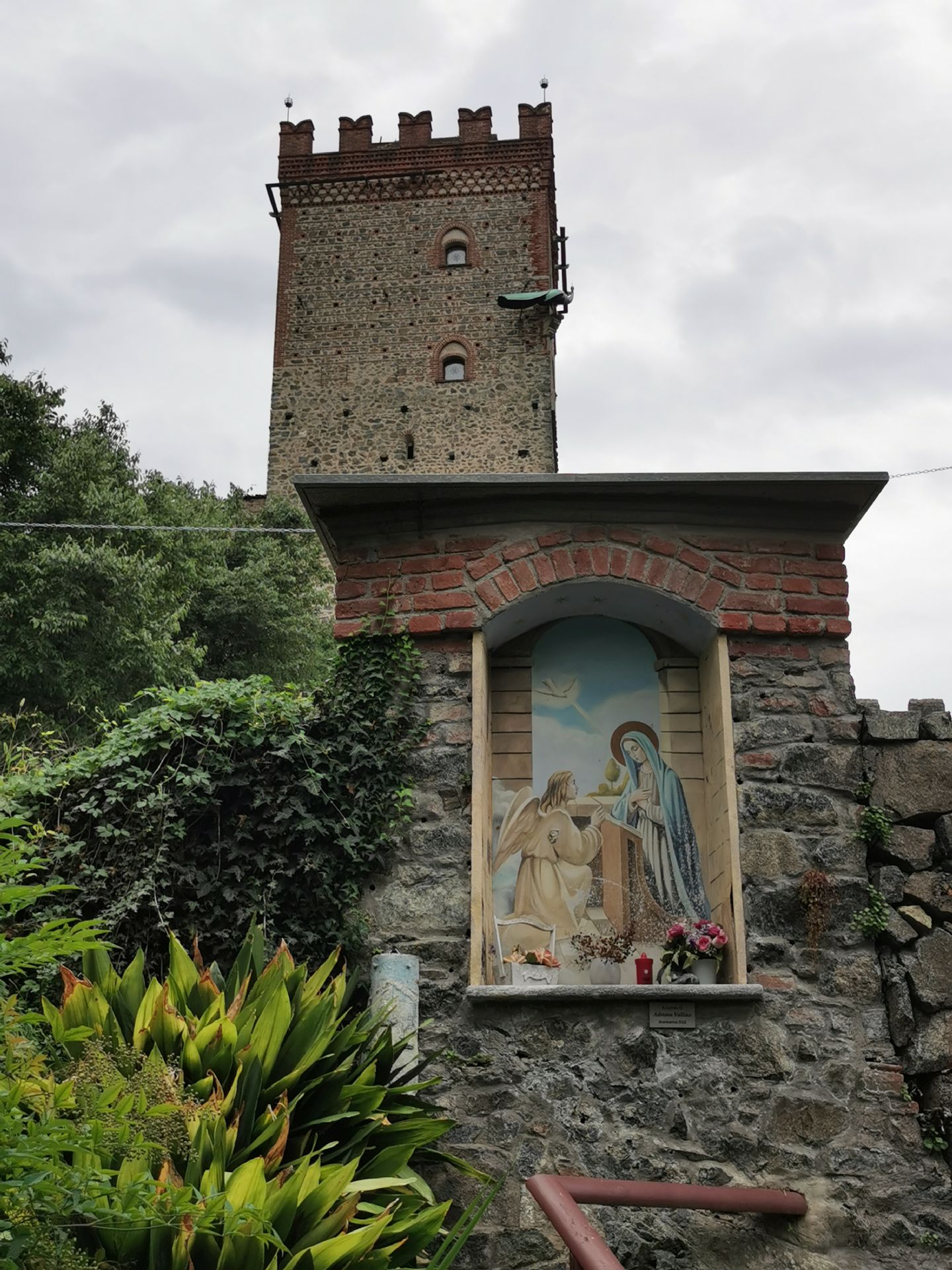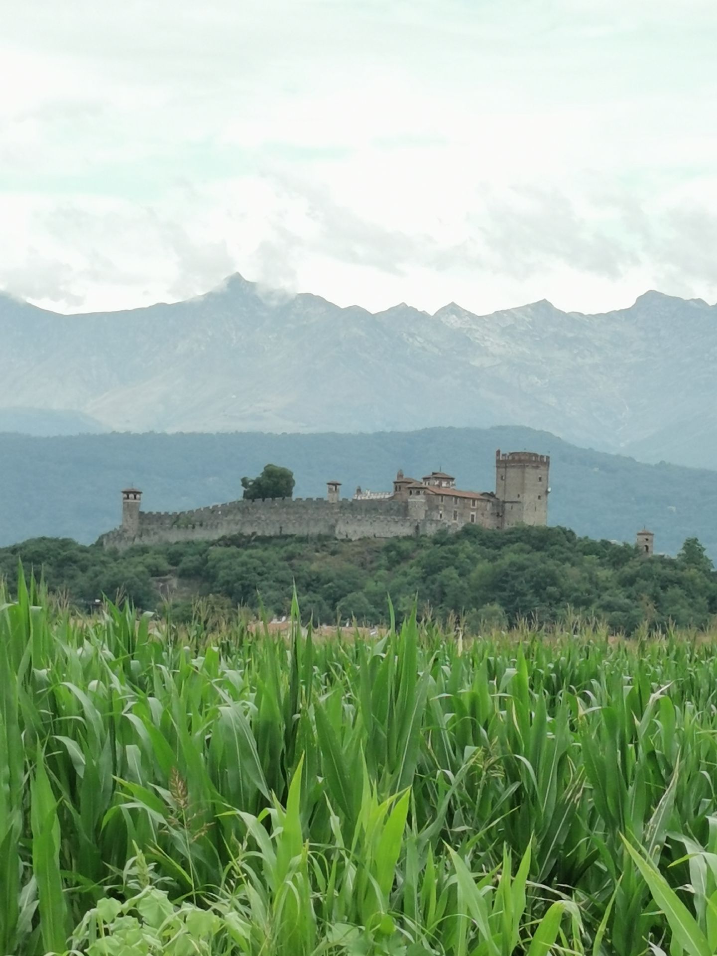 Possiamo scorgere sull’altura la Chiesa medievale di San Grato e il suo campanile, il Castello con la sua imponente cinta muraria.