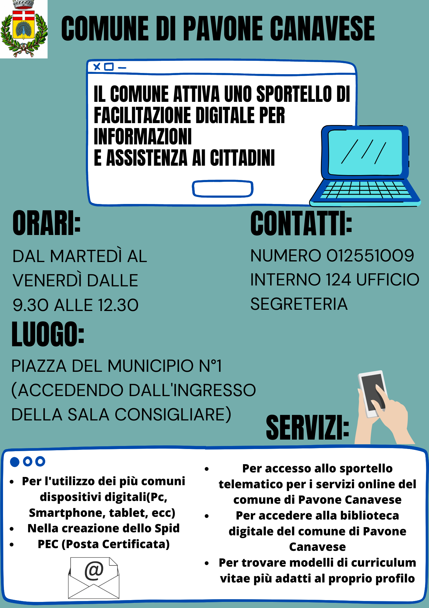 Il Comune di Pavone Canavese, grazie al lavoro dei volontari del Servizio Civile digitale, ha attivato in Piazza del Municipio n°1 (accedendo dall'ingresso alla Sala Consigliare) il nuovo servizio di facilitazione digitale, si tratta di uno sportello fisico di supporto all'uso delle nuove tecnologie presso lo Sportello al Cittadino con lo scopo di mettere i cittadini nella condizione di accedere ai servizi pubblici digitali in modo più agevole e progressivamente autonomo.