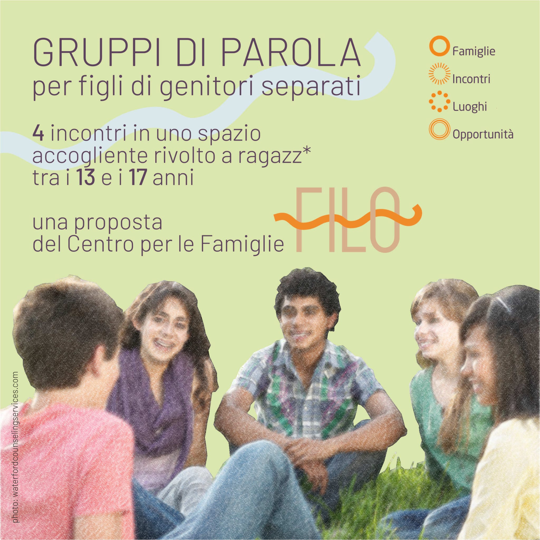 - GRUPPI DI PAROLA è uno spazio dedicato ai figli di genitori separati, in cui è possibile esprimere ciò che si vive, porre domande, ricevere informazioni, trovare sostegno e scambio tra coetanei, favorire il dialogo con mamma e papà, vivere meglio i cambiamenti e la riorganizzazione familiare. Sono avviate le iscrizioni per la partecipazione al prossimo gruppo, in partenza nel mese di novembre 2023, dedicato a ragazze e ragazzi tra 13 e 17 anni.