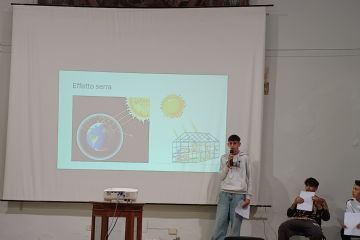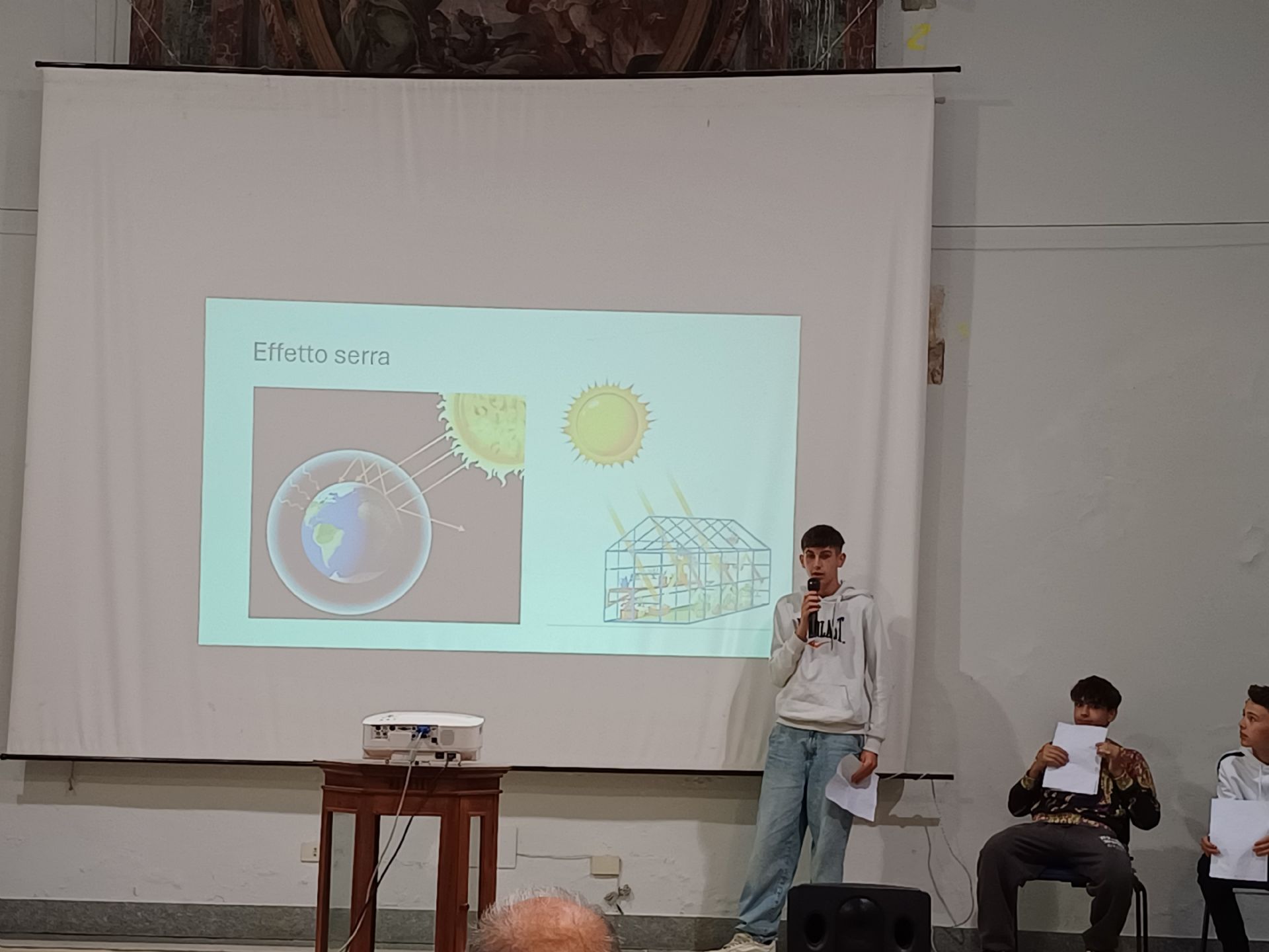 Samuele Francisco (3A di Pavone) ha illustrato l’effetto serra, uno dei principali fattori dei cambiamenti climatici: la concentrazione dei gas serra nella atmosfera causati dalla produzione di energia con fonti fossili è la causa principale del riscaldamento della crosta terrestre e dei conseguenti cambiamenti climatici.