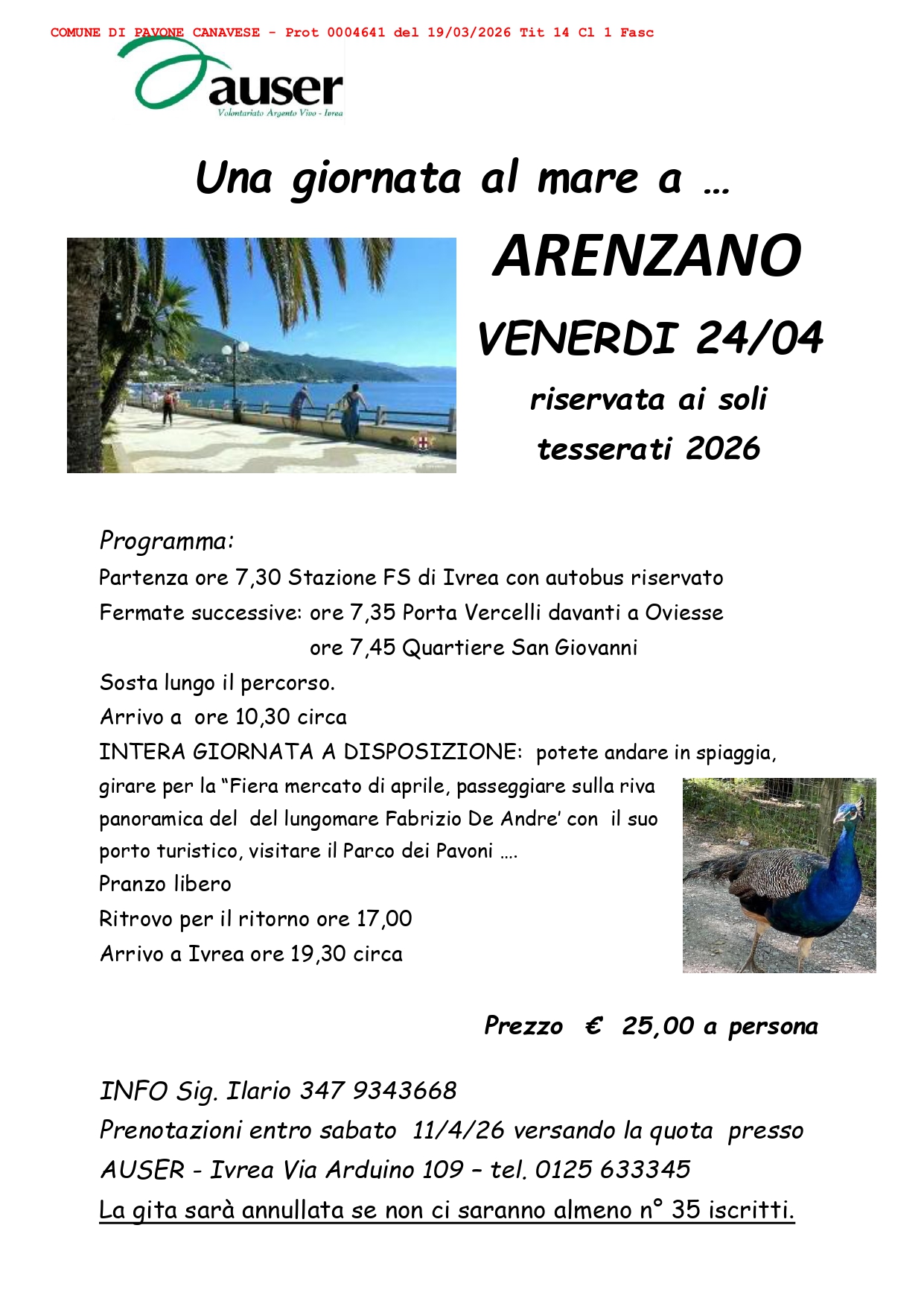 l'Associazione Auser Argento Vivo di Ivrea propone una giornata al mare ad Arenzano il giorno venerdì 24 aprile, riservata ai soli tesserati 2026.