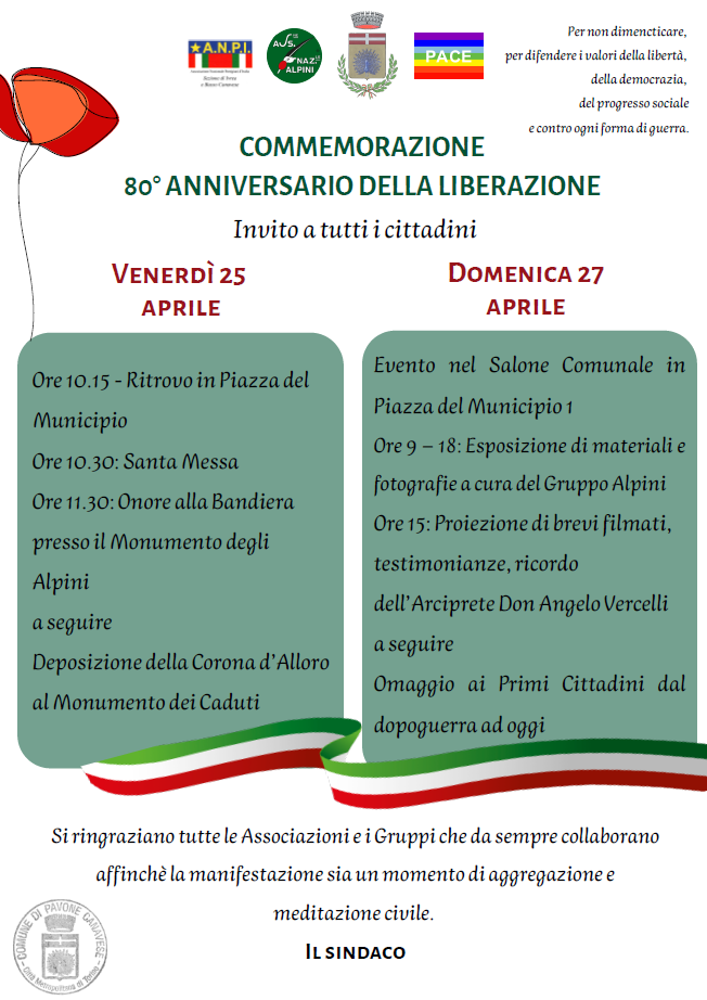 L'Amministrazione Comunale invita la cittadinanza a celebrare l'80° Anniversario della Liberazione, a tal proposito il Sindaco desidera condividere alcune riflessioni sulla commemorazione, disponibili in allegato.