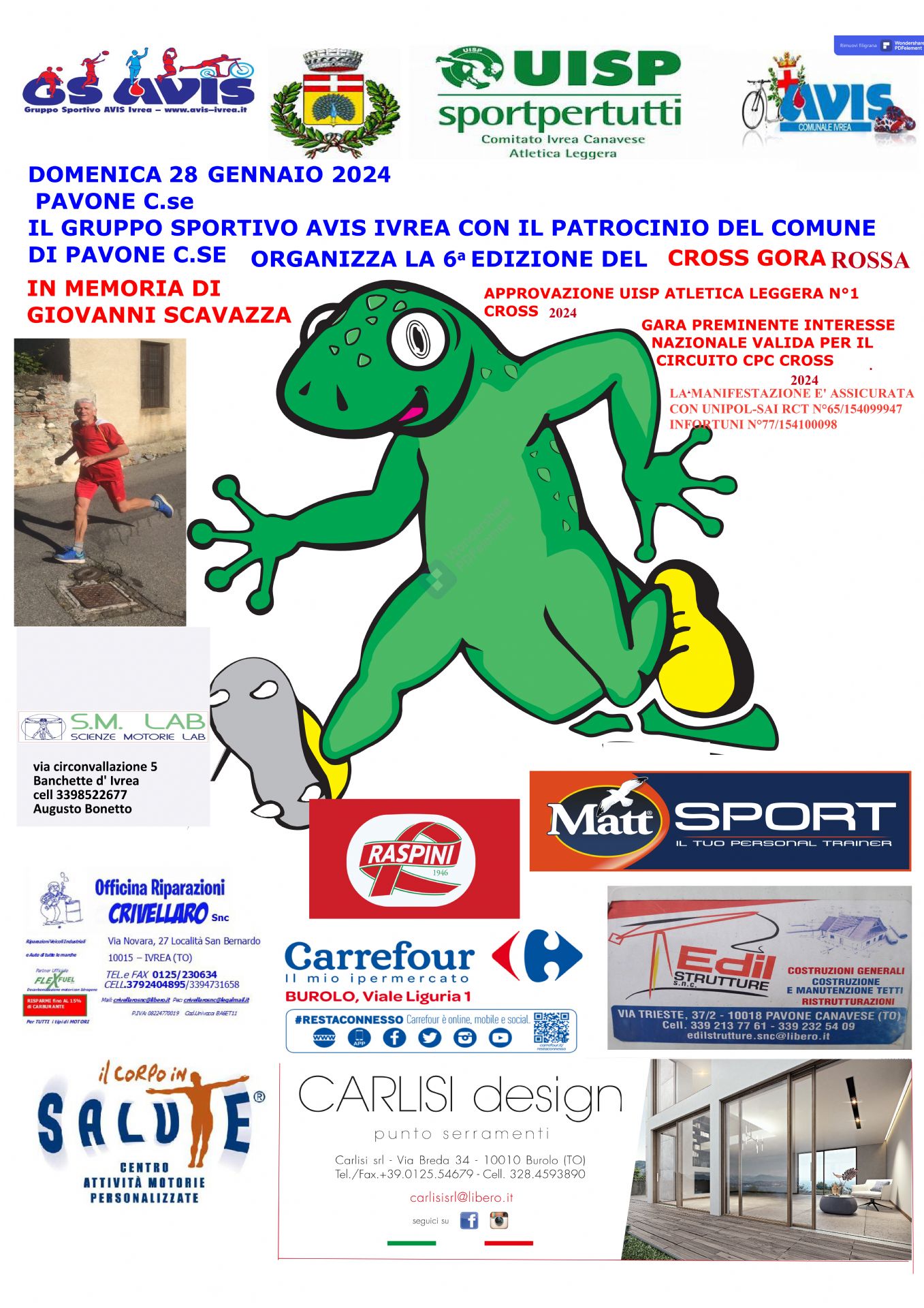 Domenica 28 Gennaio 2024 presso il Comune di Pavone Canavese, con ritrovo alla Gora Rossa in via Sanguignolo, il gruppo sportivo AVIS Ivrea con il patrocinio del Comune di Pavone organizza la 6° edizione del CROSS GORA ROSSA, gara di interesse nazionale valida per il circuito CPC CROSS 2024.