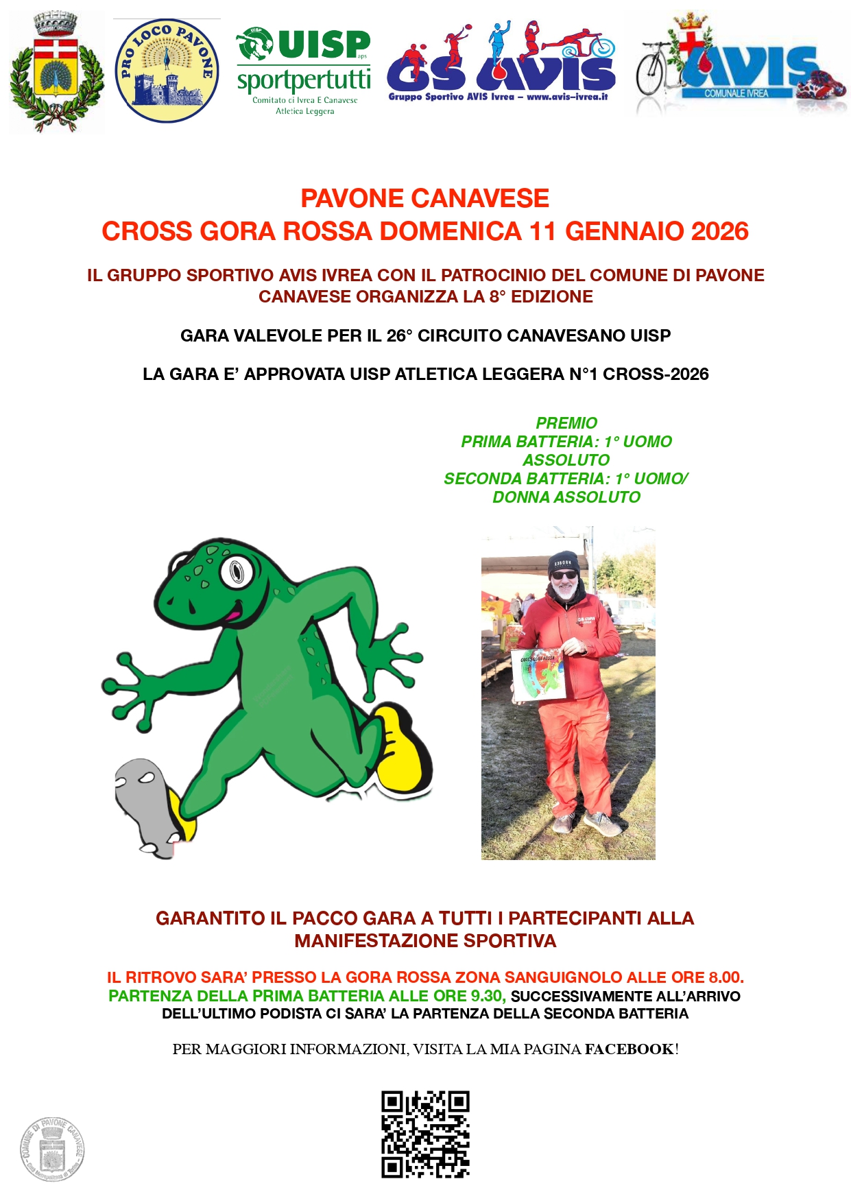 Domenica 11 Gennaio 2026 presso il Comune di Pavone Canavese, con ritrovo alla Gora Rossa in via Sanguignolo, il gruppo sportivo AVIS Ivrea con il patrocinio del Comune di Pavone organizza l' 8° edizione del CROSS GORA ROSSA.