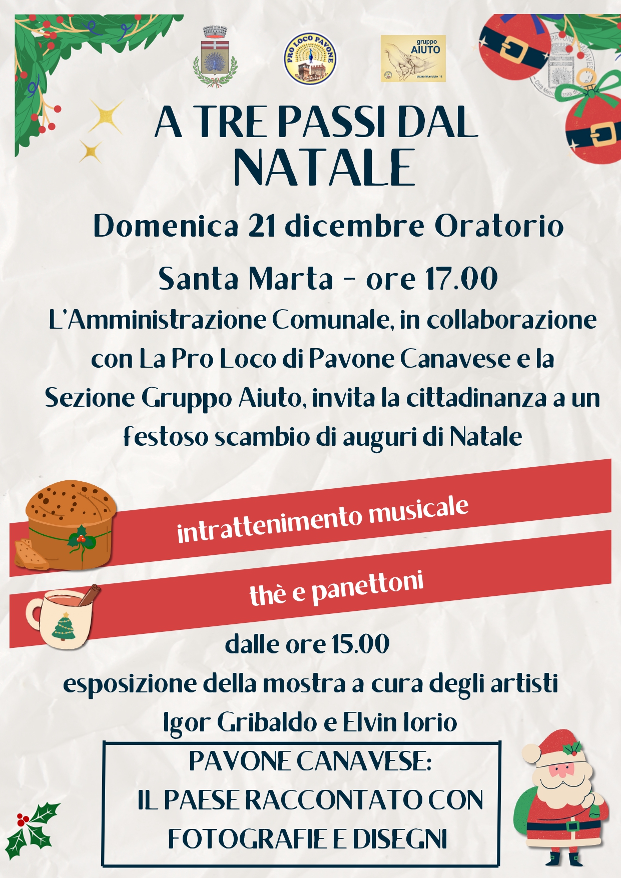 Pro Loco di Pavone Canavese e la Sezione Gruppo Aiuto, invita la cittadinanza a un festoso scambio di auguri di Natale domenica 21 dicembre presso l'Oratorio Santa Marta a partire dalle ore 15,00 con l'esposizione della mostra "Pavone Canavese: il paese raccontato con fotografie e disegni" e dalle ore 17,00 con intrattenimento musicale, thè e panettoni.