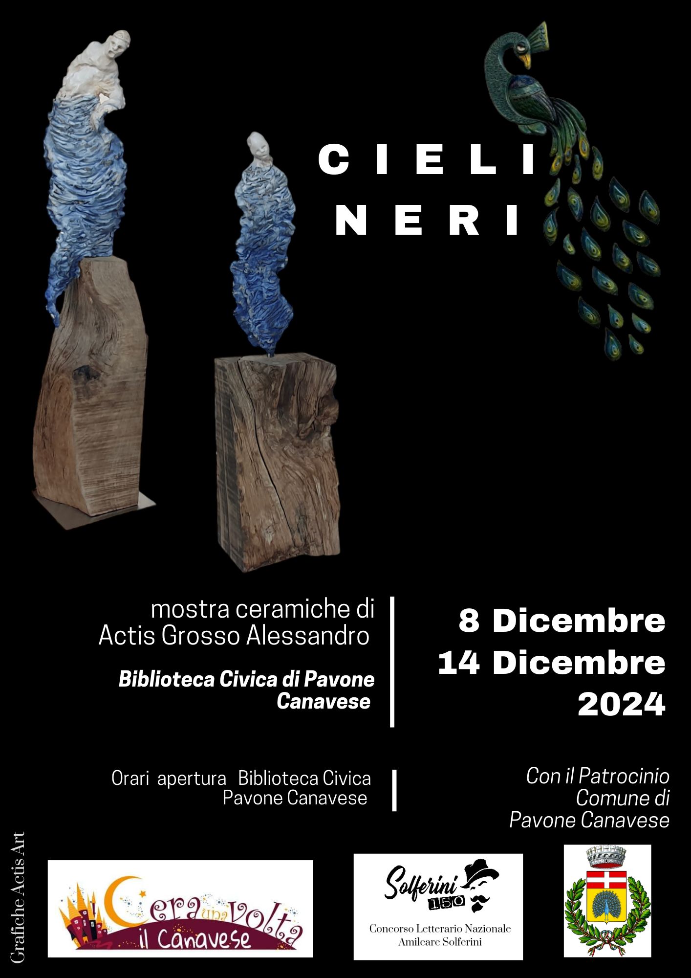 Dalla Domenica 8 Dicembre al Sabato 14 Dicembre 2024 si terrà l'evento "Cieli Neri", una mostra di Ceramiche dello scultore Alessandro Actis Grosso, presso la Biblioteca Comunale di Pavone Canavese.