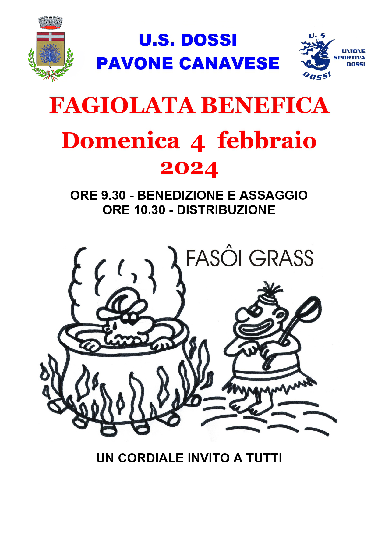 L'Unione Sportiva Dossi di Pavone Canavese organizza una "Fagiolata Benefica" Domenica 4 Febbraio 2024.