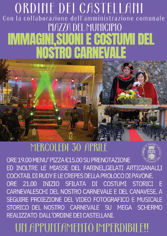 Alle ore 19.00 avrà inizio la cena su prenotazione e a seguire, dalle ore 21.00, la sfilata di costumi storici e carnevaleschi. In conclusione una proiezione fotografica e musicale sul Carnevale pavonese realizzata dall'Ordine dei Castellani.