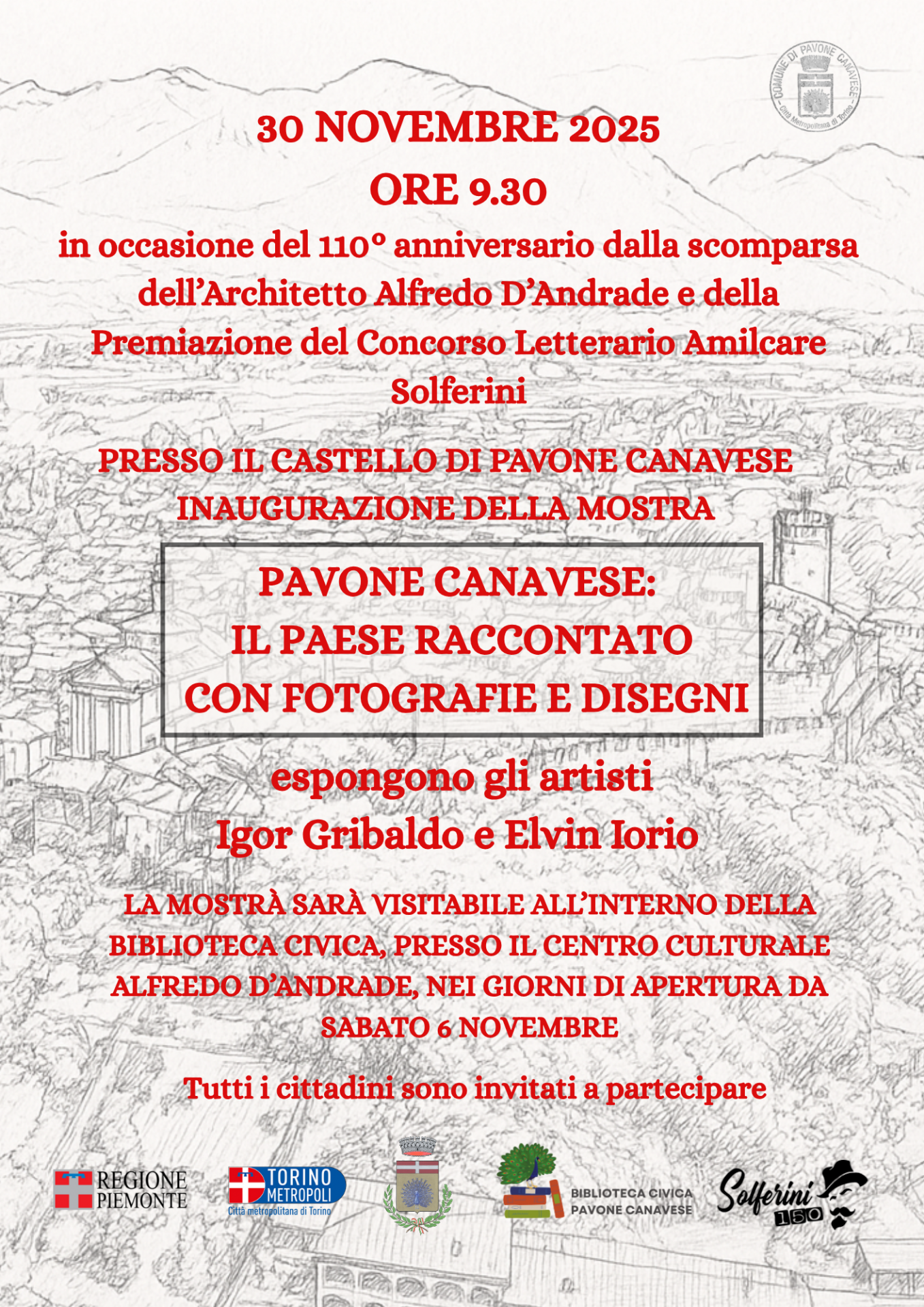 L'Amministrazione Comunale, in collaborazione con la Biblioteca Civica di Pavone Canavese, inaugura il 30 novembre alle ore 9.30, in occasione del 110° anniversario dalla scomparsa dell'Architetto Alfredo D'Andrade e della Premiazione del Concorso Letterario Amilcare Solferini, presso il Castello di Pavone Canavese la mostra fotografica