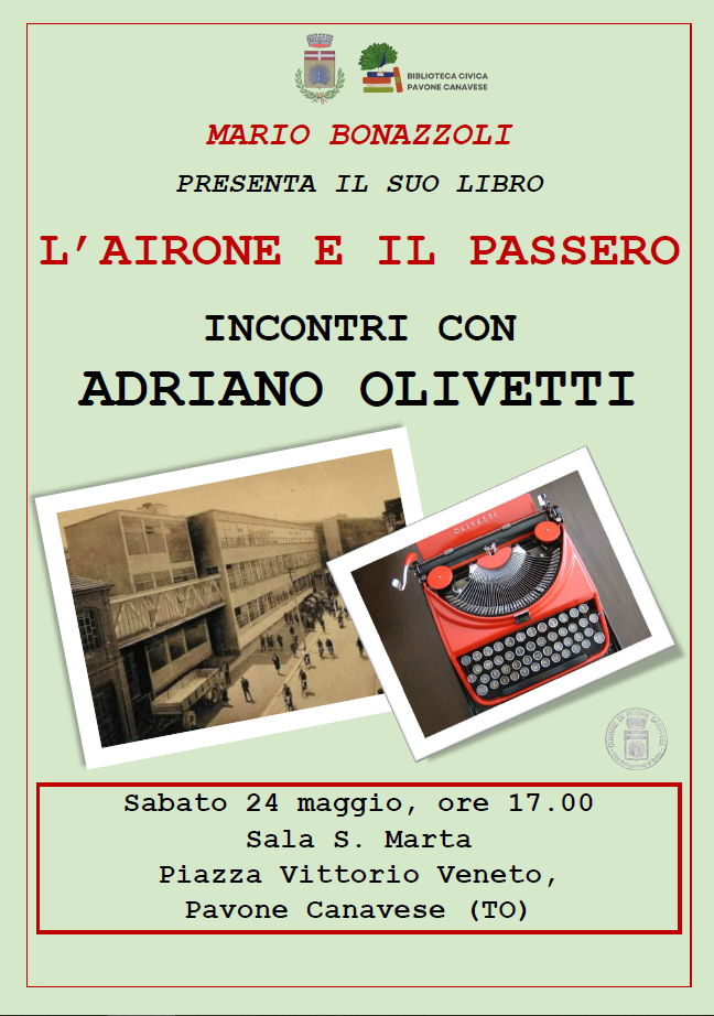 Il 24 Maggio 2025 avrà luogo la presentazione del libro "L'Airone e il Passero. Incontri con Adriano Olivetti", scritto da Mario Bonazzoli.