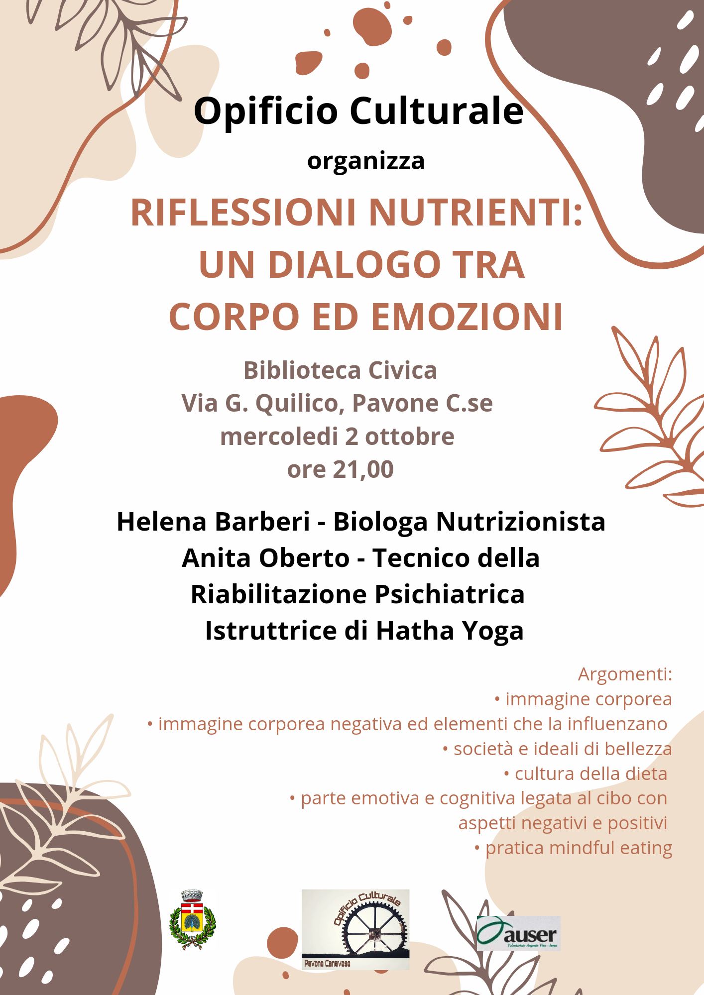 L'Opificio Culturale, in collaborazione con l'AUSER e il Comune di Pavone Canavese, organizza "Riflessioni Nutrienti: un Dialogo tra Corpo ed Emozioni", un incontro a tema alimentazione e corpo, presentato da Helena Barbieri e Anita Oberto.