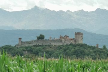Possiamo scorgere sull’altura la Chiesa medievale di San Grato e il suo campanile, il Castello con la sua imponente cinta muraria.