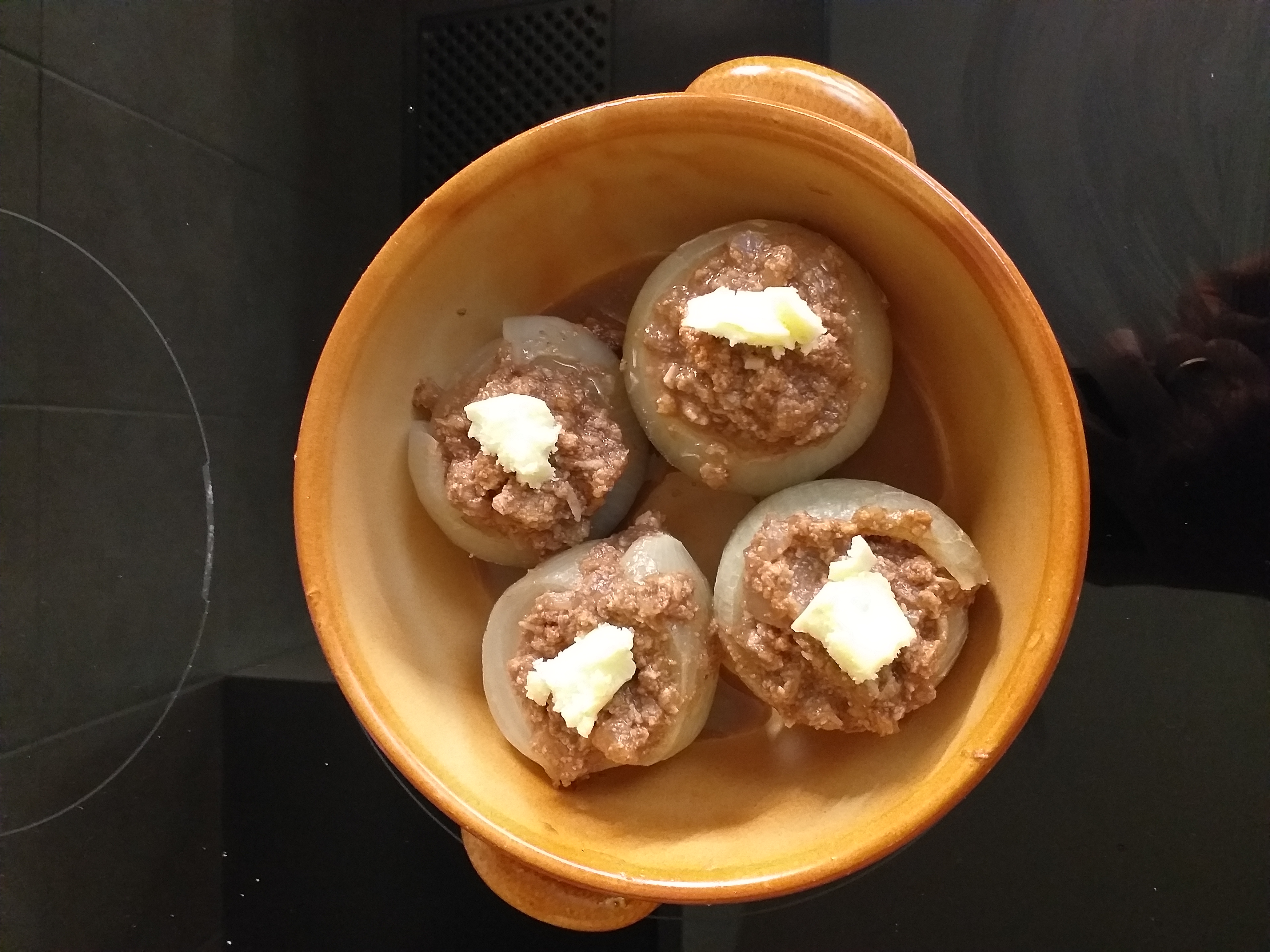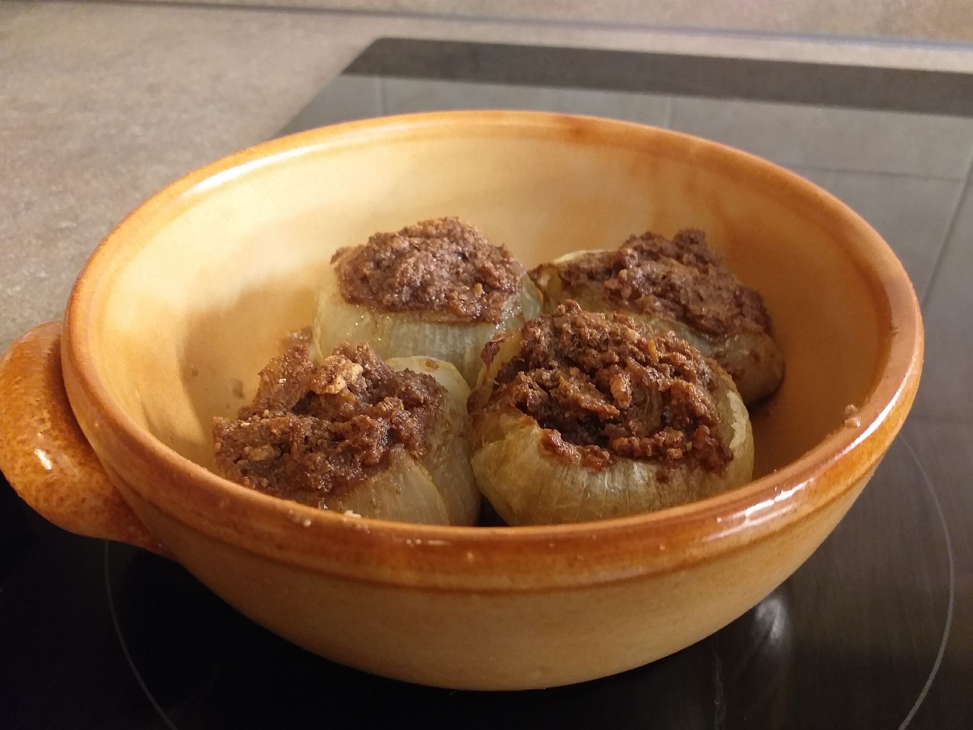 - 1 kg di cipolle gialle tonde e piatte di media grandezza da far bollire brevemente in acqua salata - (a cottura terminata, tagliare la calotta superiore e svuotarle lasciando pochi strati esterni quindi tritare la parte interna della cipolla);